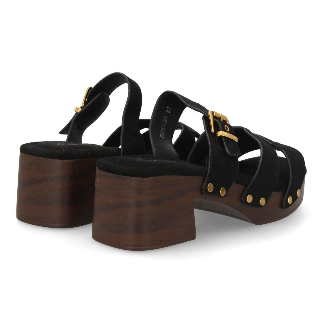 Sandalia para mujer con tachuelas y suela estilo madera diseño de varias tiras en el empeine cierre de hebilla. Un modelo cómodo y ligero para primavera verano.