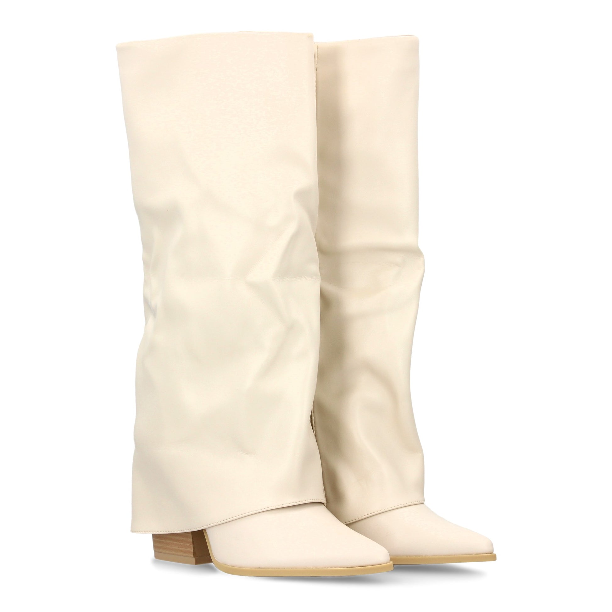 Bota alta de tacón para mujer con diseño moderno con acabado efecto arrugado elegante con punta fina y tacón ancho bajo. Ideal para temporada Otoño invierno.