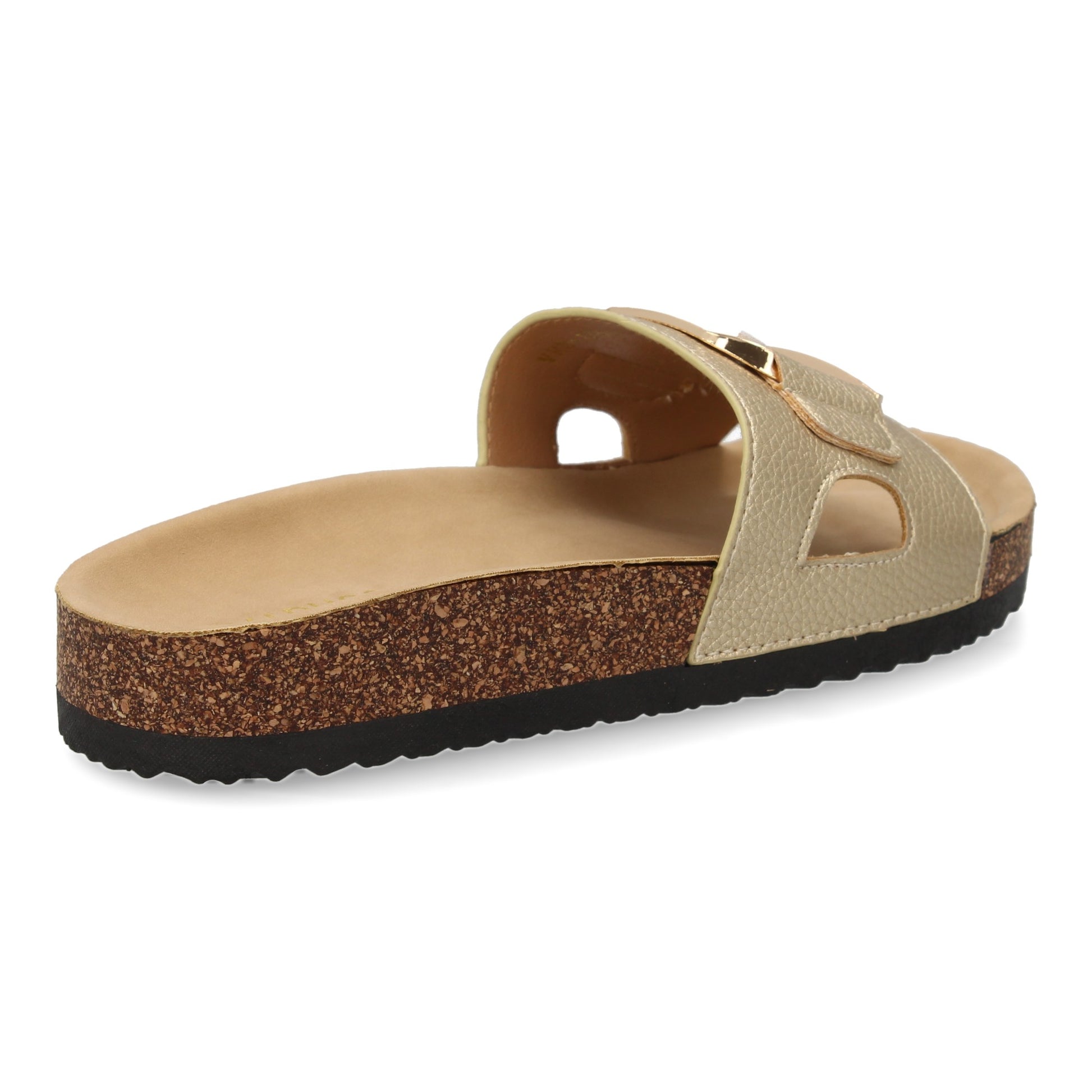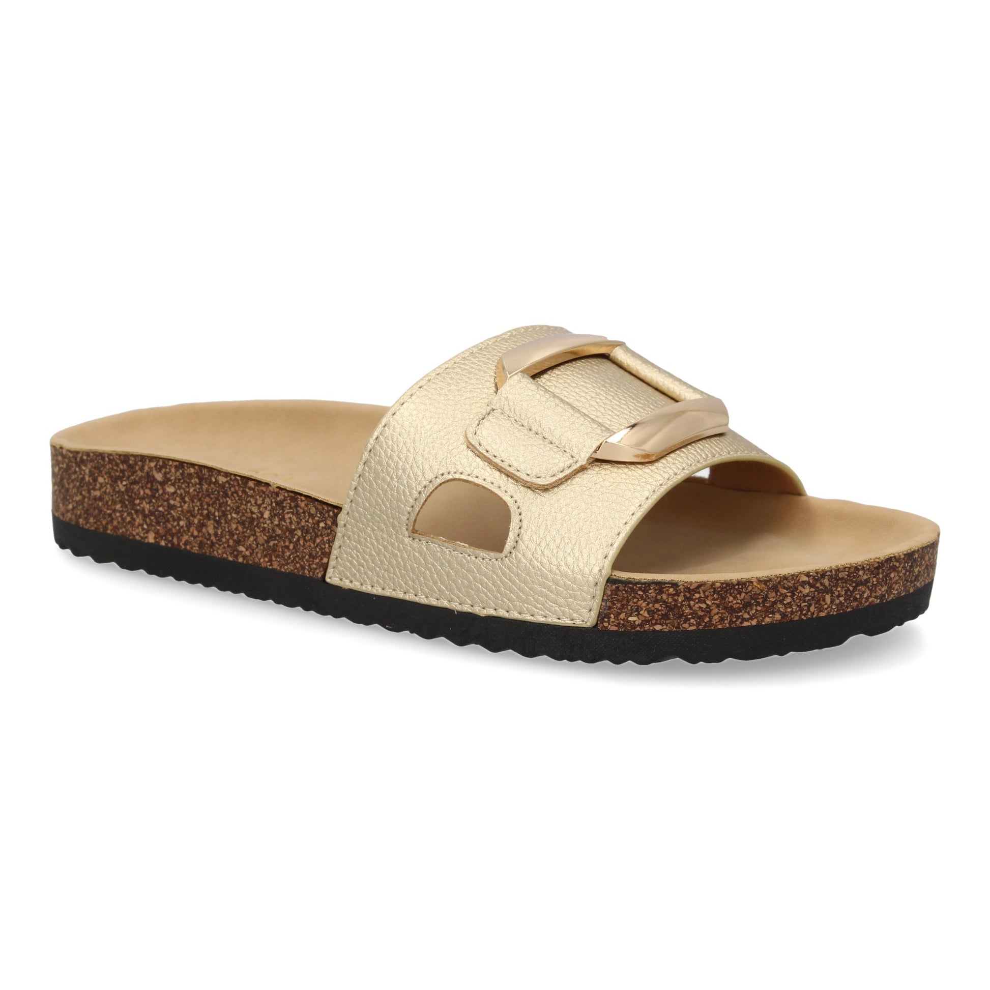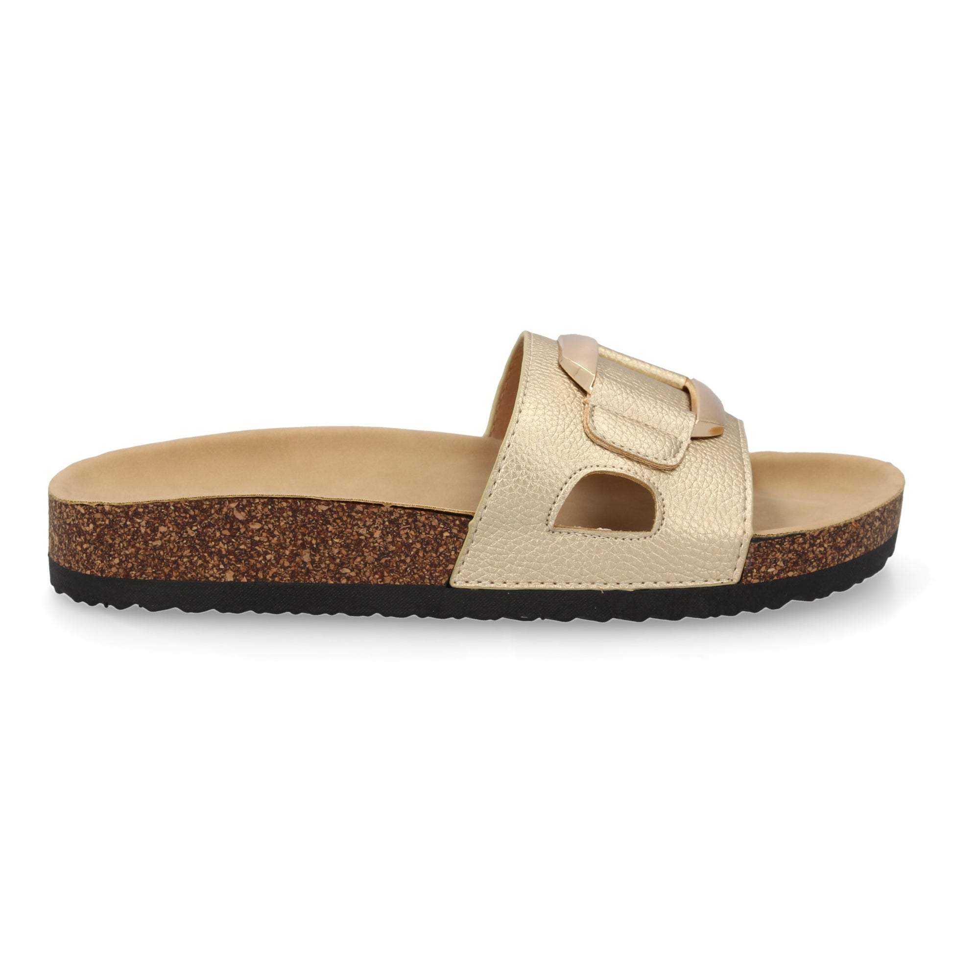 Sandalia plana de mujer comoda y elegante diseño moderno con material bio detalle metalico en la pala ideales para primavera verano.