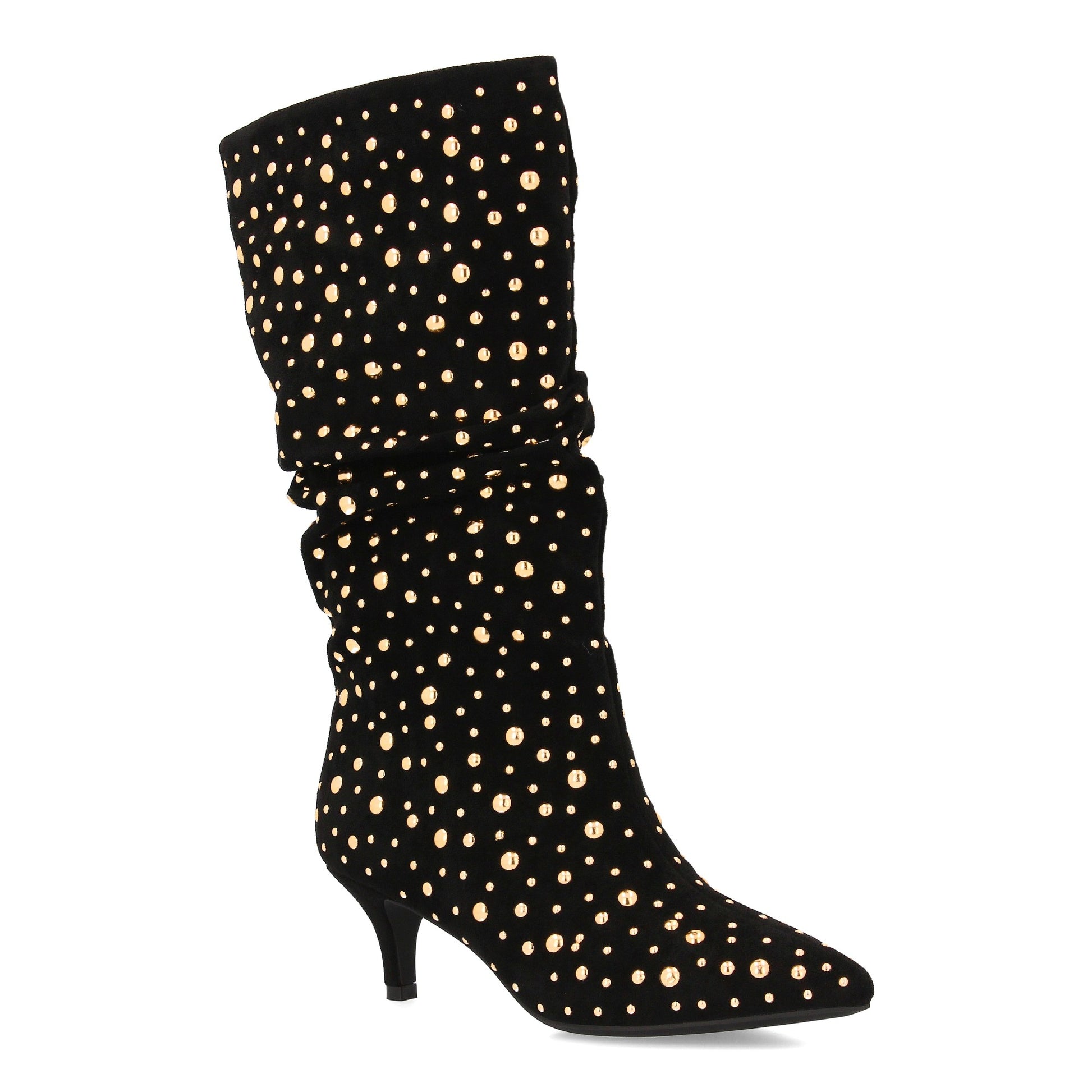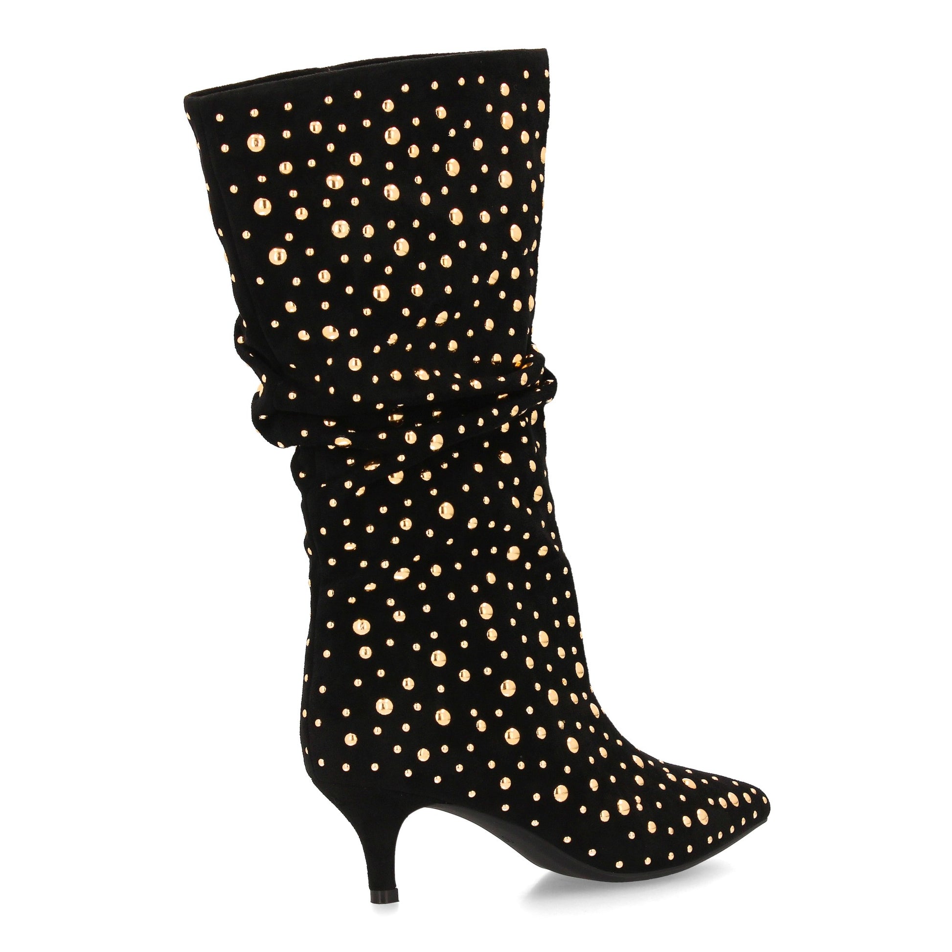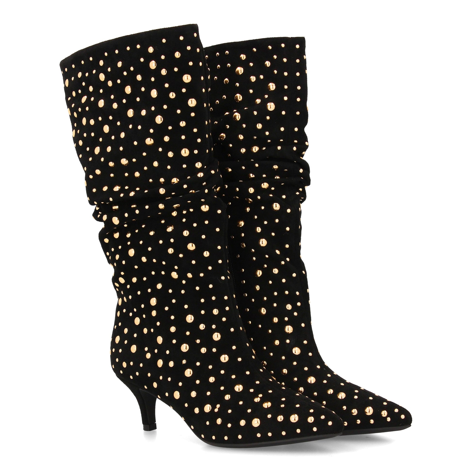Bota de mujer de caña arrugada decorada con tachuelas metálicas brillantes tipo pedrería. Fruncido tacon fino punta fina. Ideal para temporada Otoño invierno.