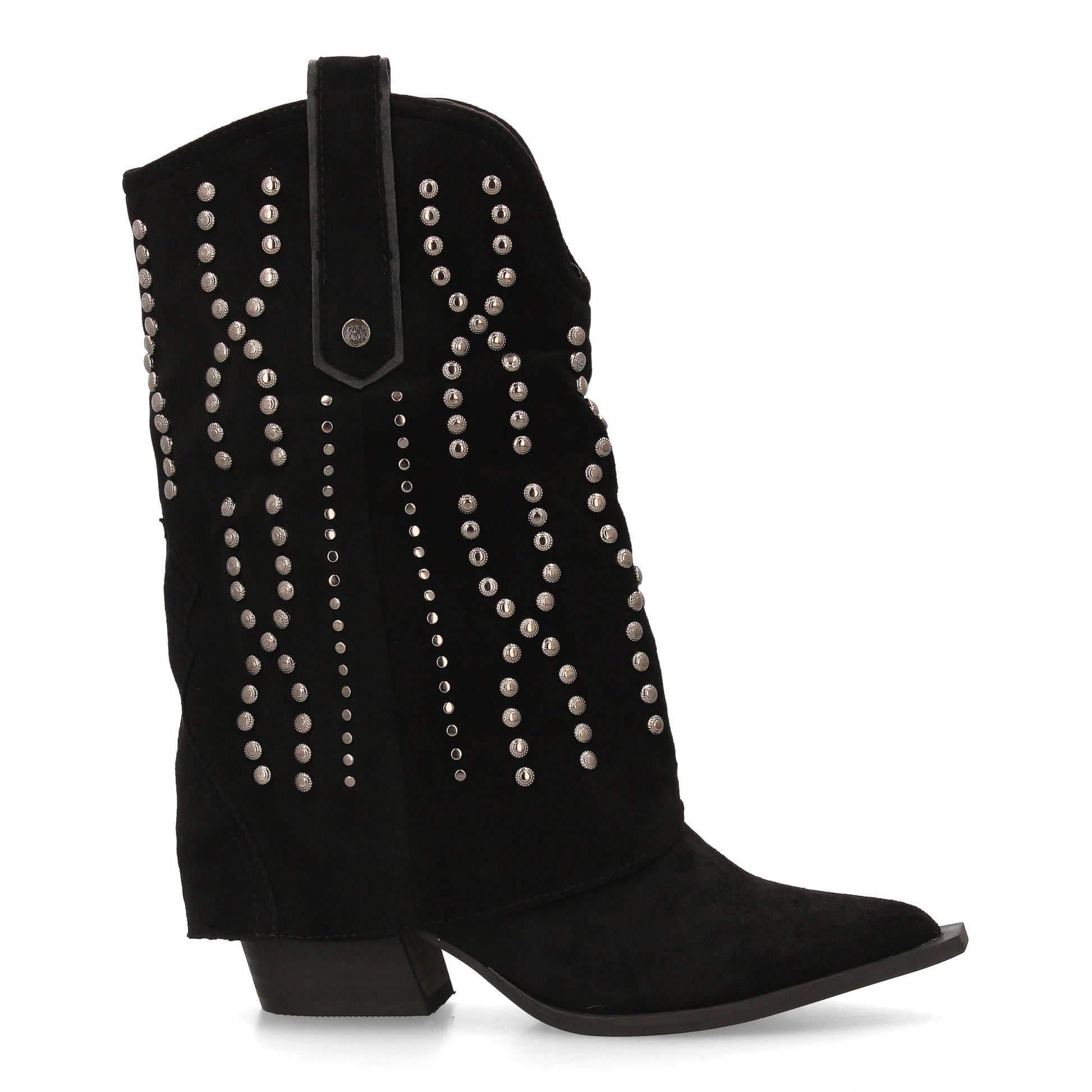 Botín cowboy para mujer con caña media y diseño campero. Decorado con tachuelas metálicas en patrón geométrico punta fina y tacón cubano cuadrado. Ideal para la temporada otoño invierno.