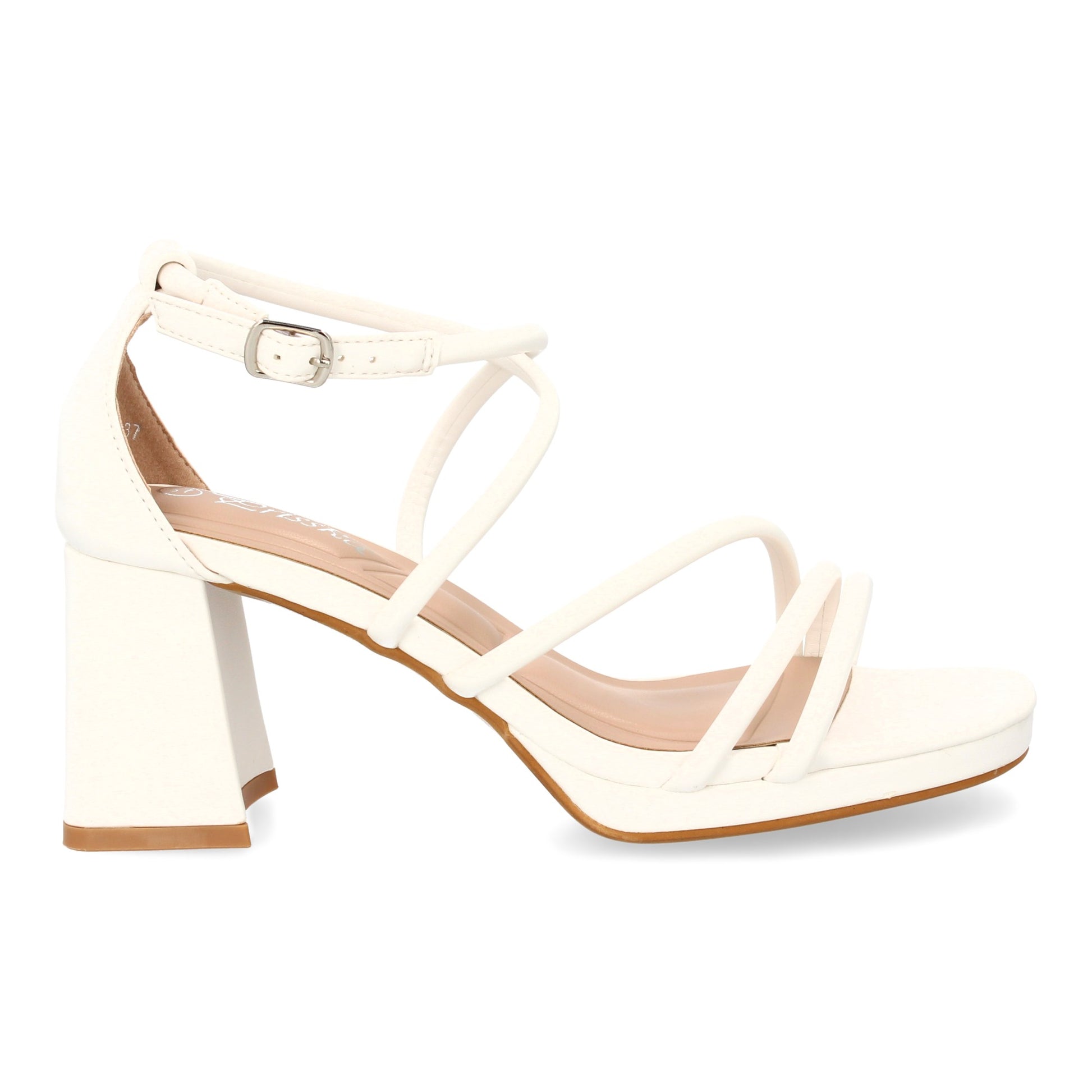 Sandalia de tacón con diseño de tiras finas y talón cerrado. Su plataforma y tacón ancho proporcionan comodidad ideal para ocasiones especiales. Cierre de hebilla.