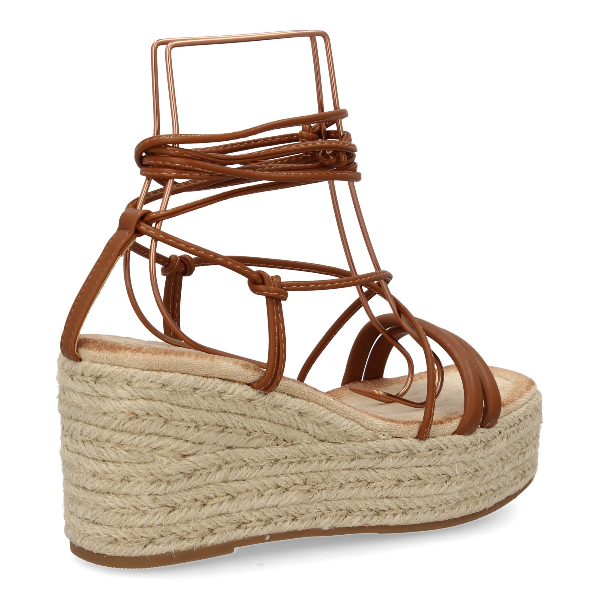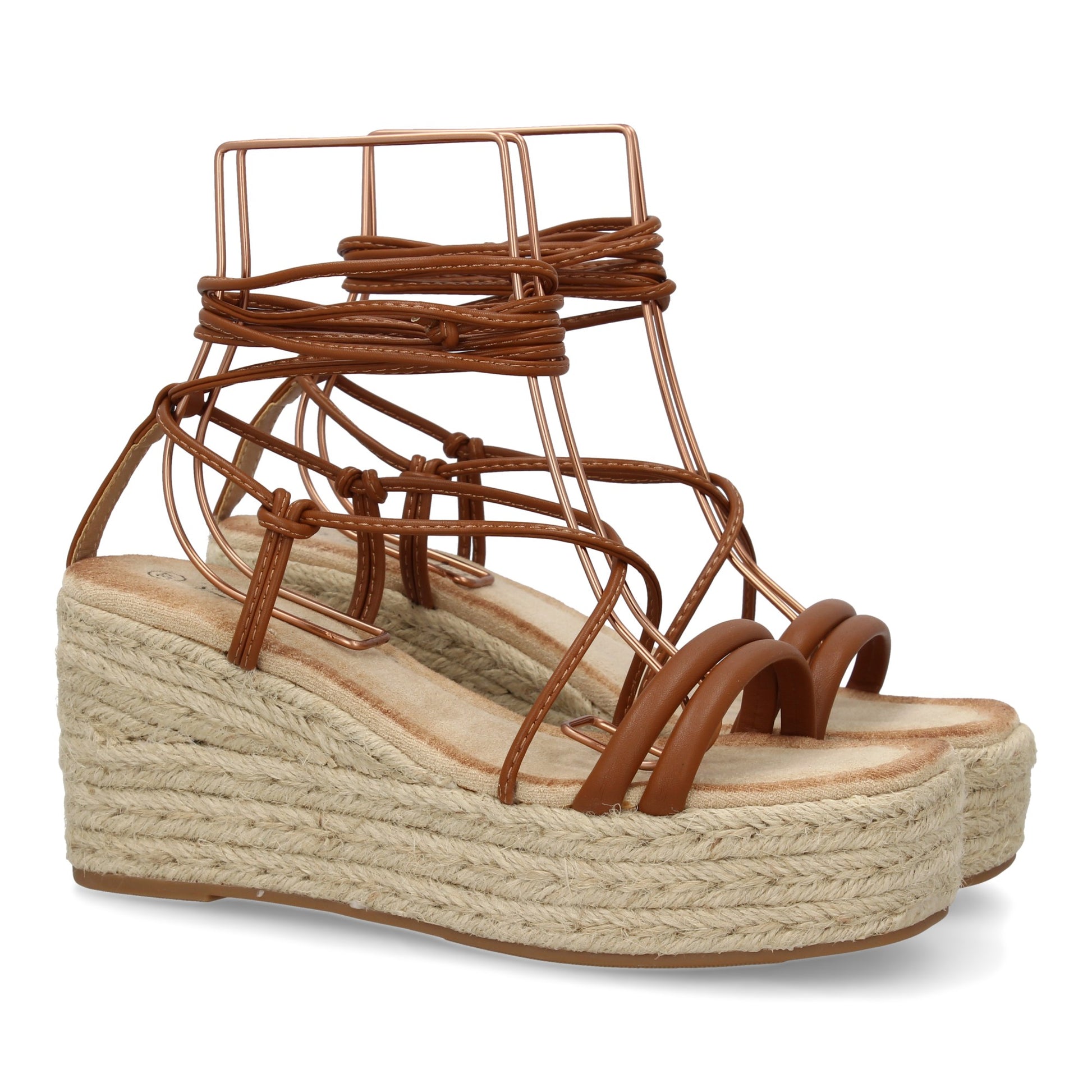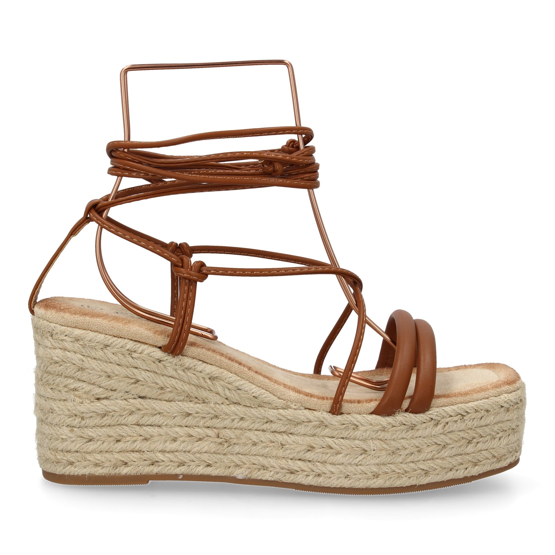 Sandalia de cuña de yute para mujer comodas y elegantes diseño moderno con tiras cruzadas y cierre de cordones al tobillo.