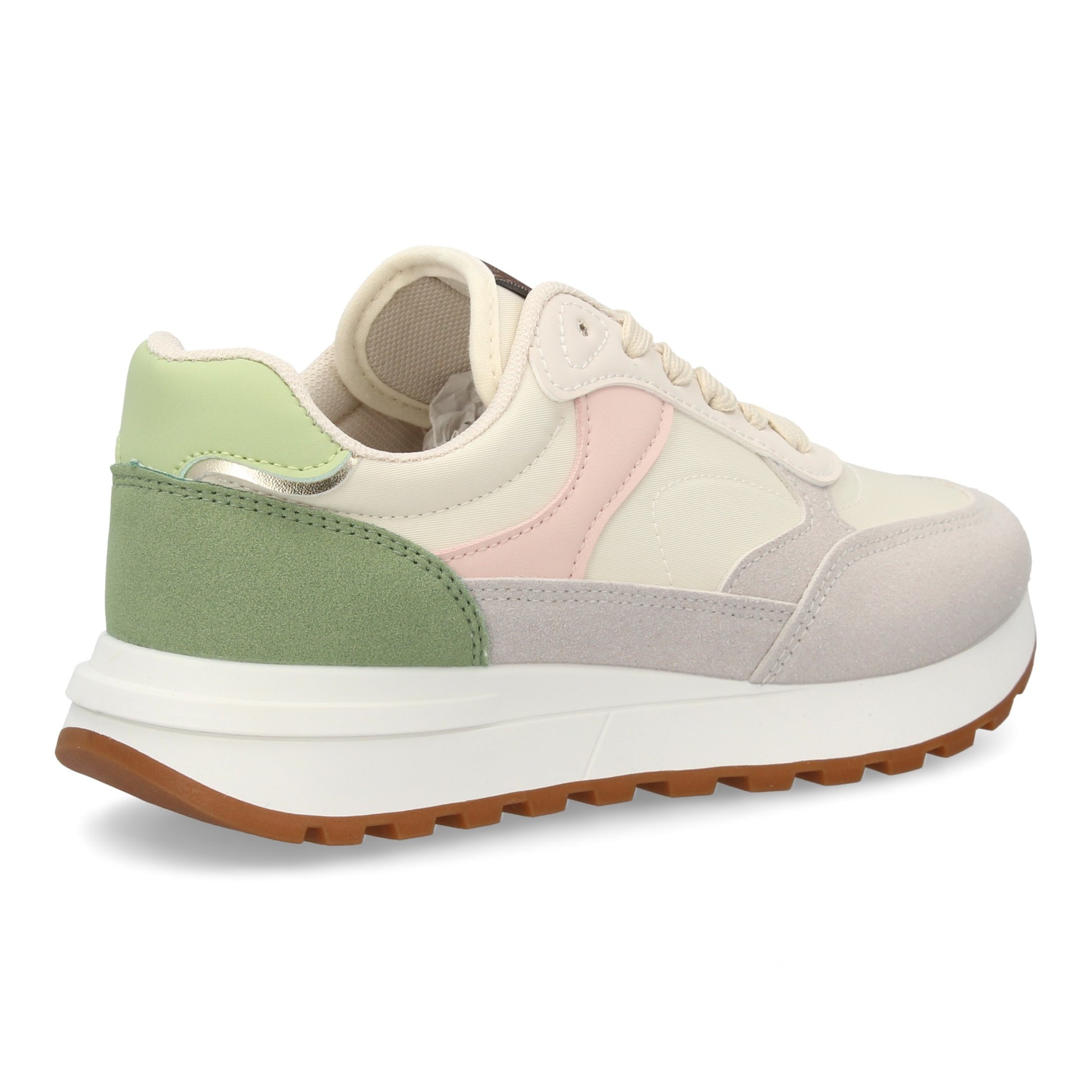 Zapatilla deportiva para mujer de estilo casual combina materiales y texturas con un diseño moderno y versátil. Incorpora paneles superpuestos en contraste con acabado brillante suela ancha con relieve dentado.