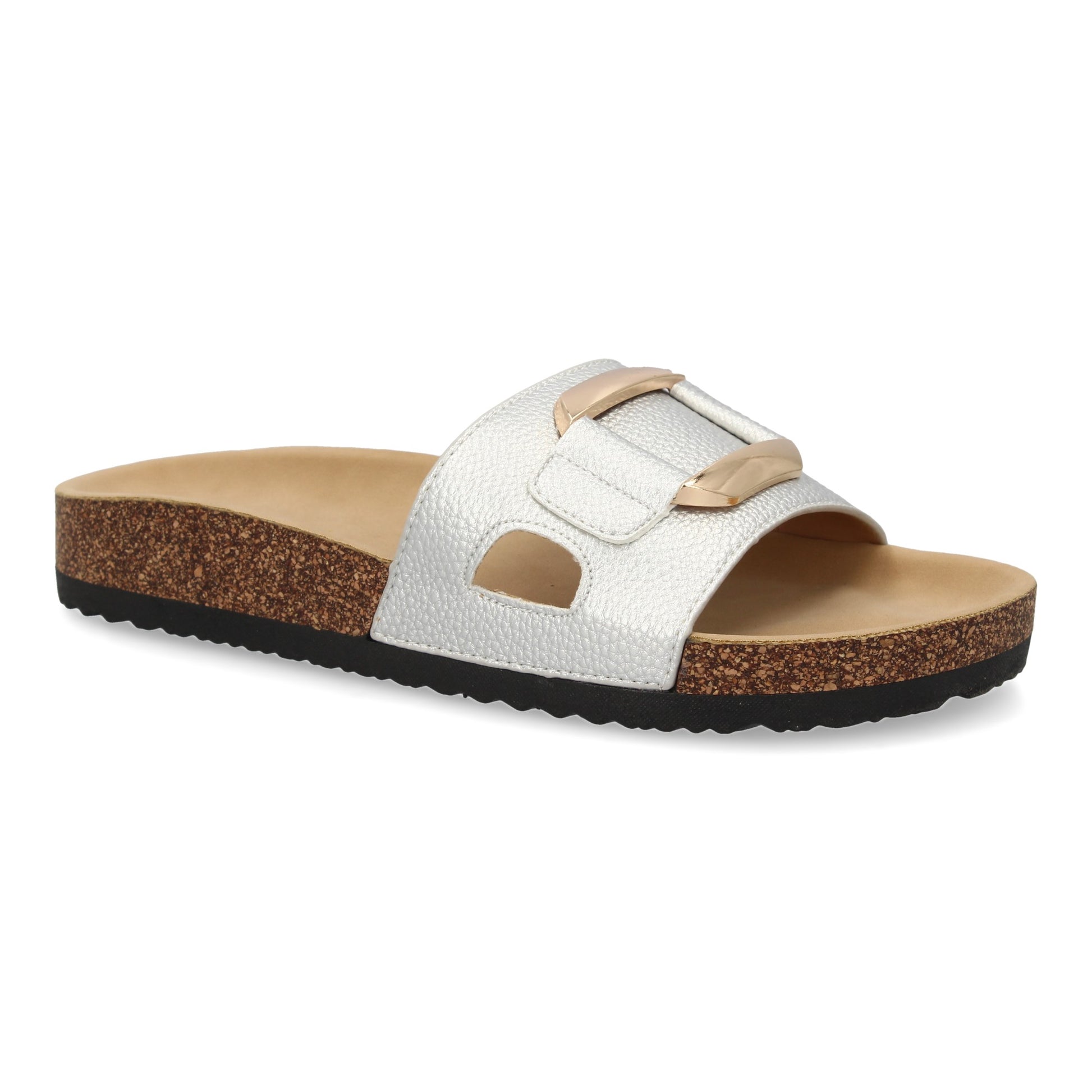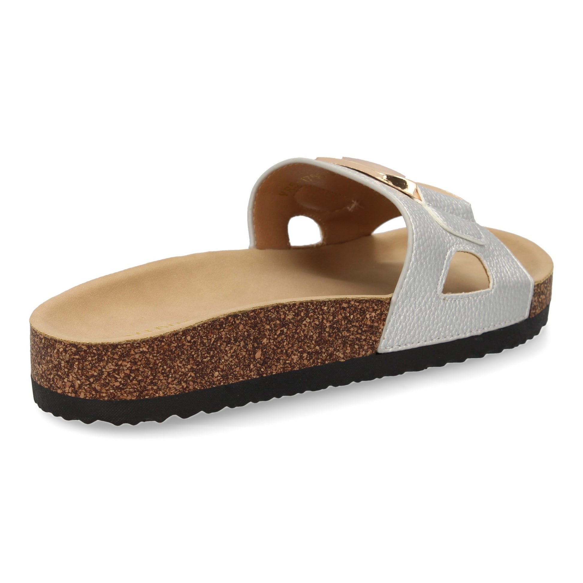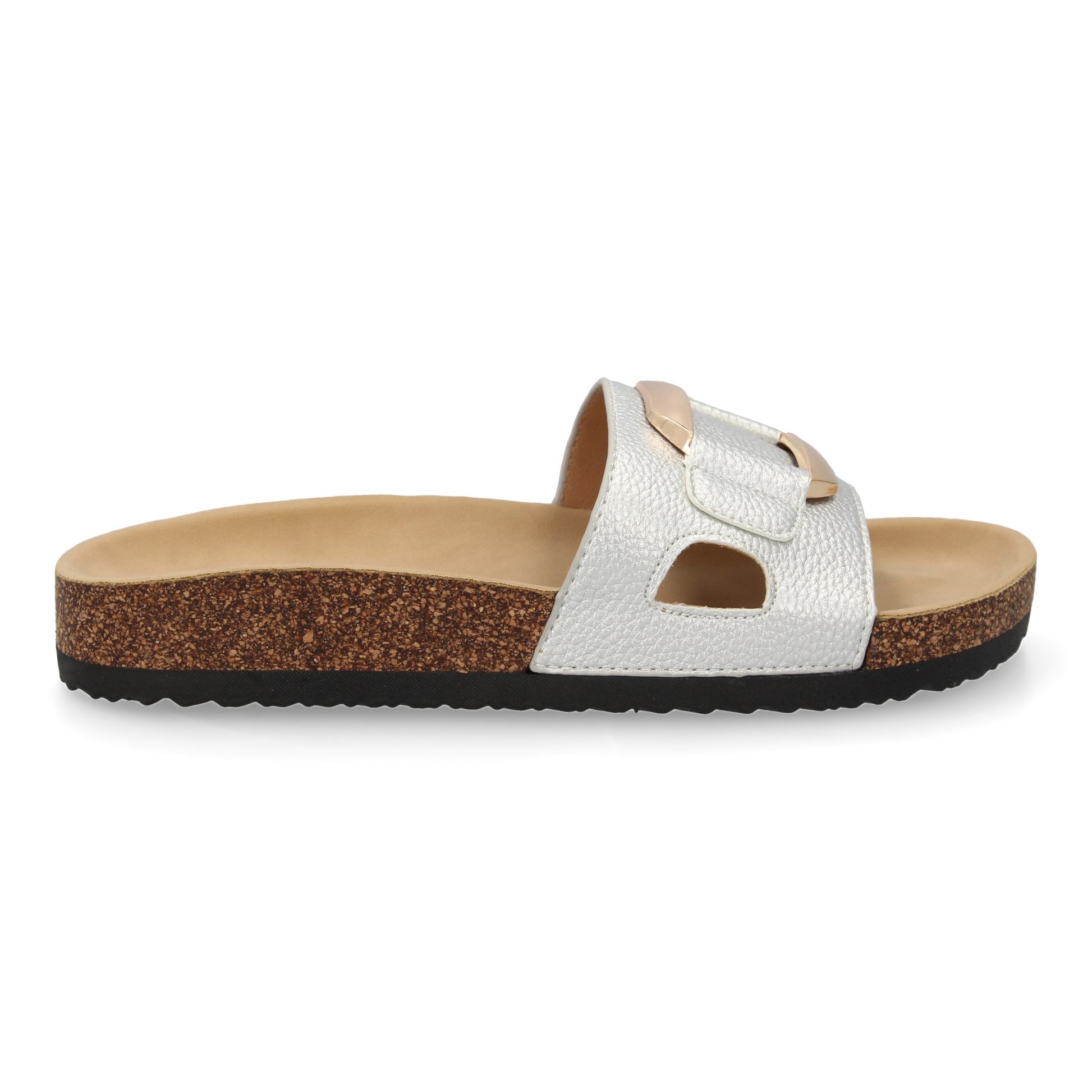 Sandalia plana de mujer comoda y elegante diseño moderno con material bio detalle metalico en la pala ideales para primavera verano.