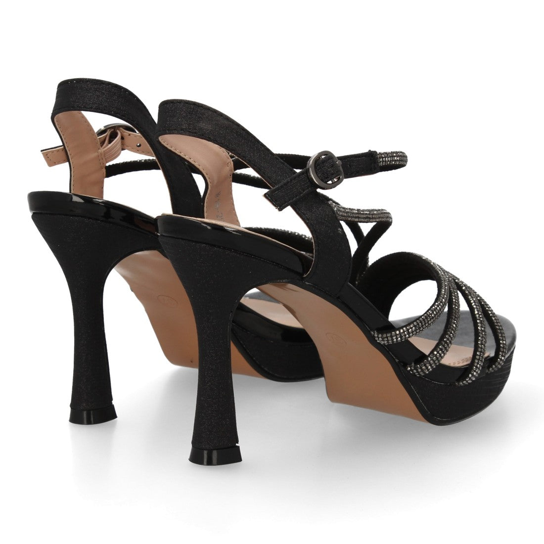 Sandalia de tacón fino con plataforma para eventos celebraciones y ocasiones especiales. Pala de tiras finas decoradas con brillantes cierre de hebilla comodas para mujer.