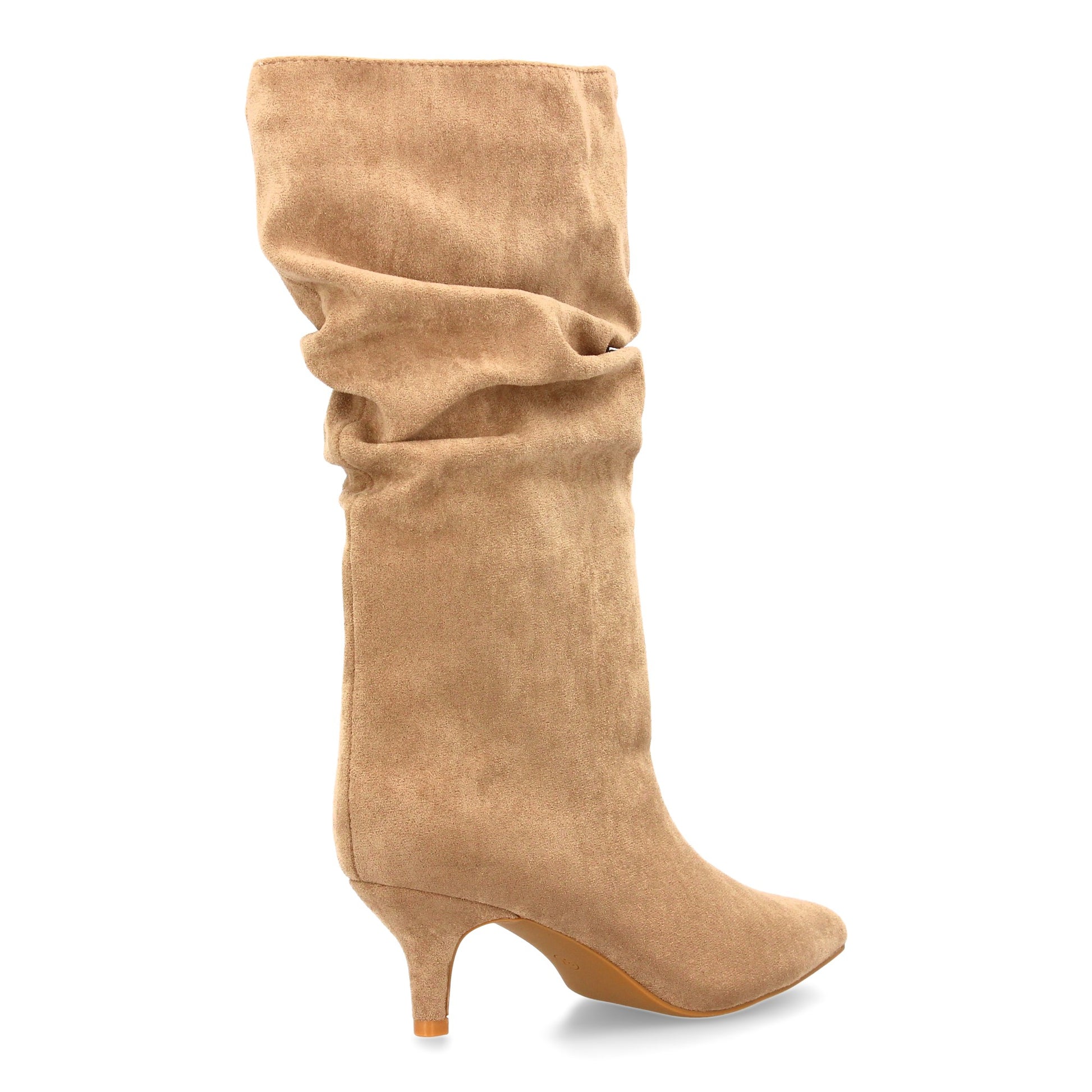 Bota de caña alta efecto arrugado tacón fino. Cierre de cremallera estampado liso ideal para mujer temporada otoño invierno.