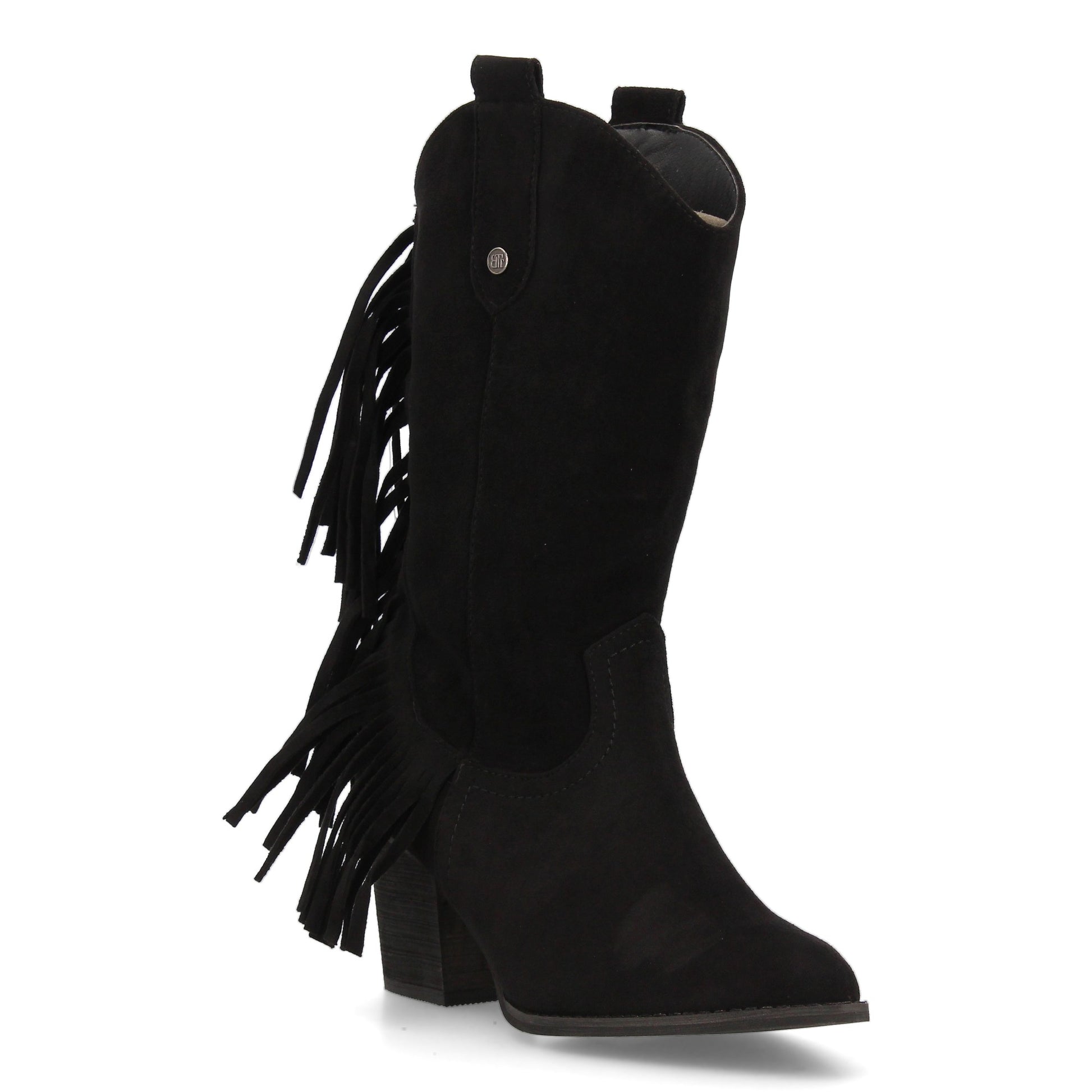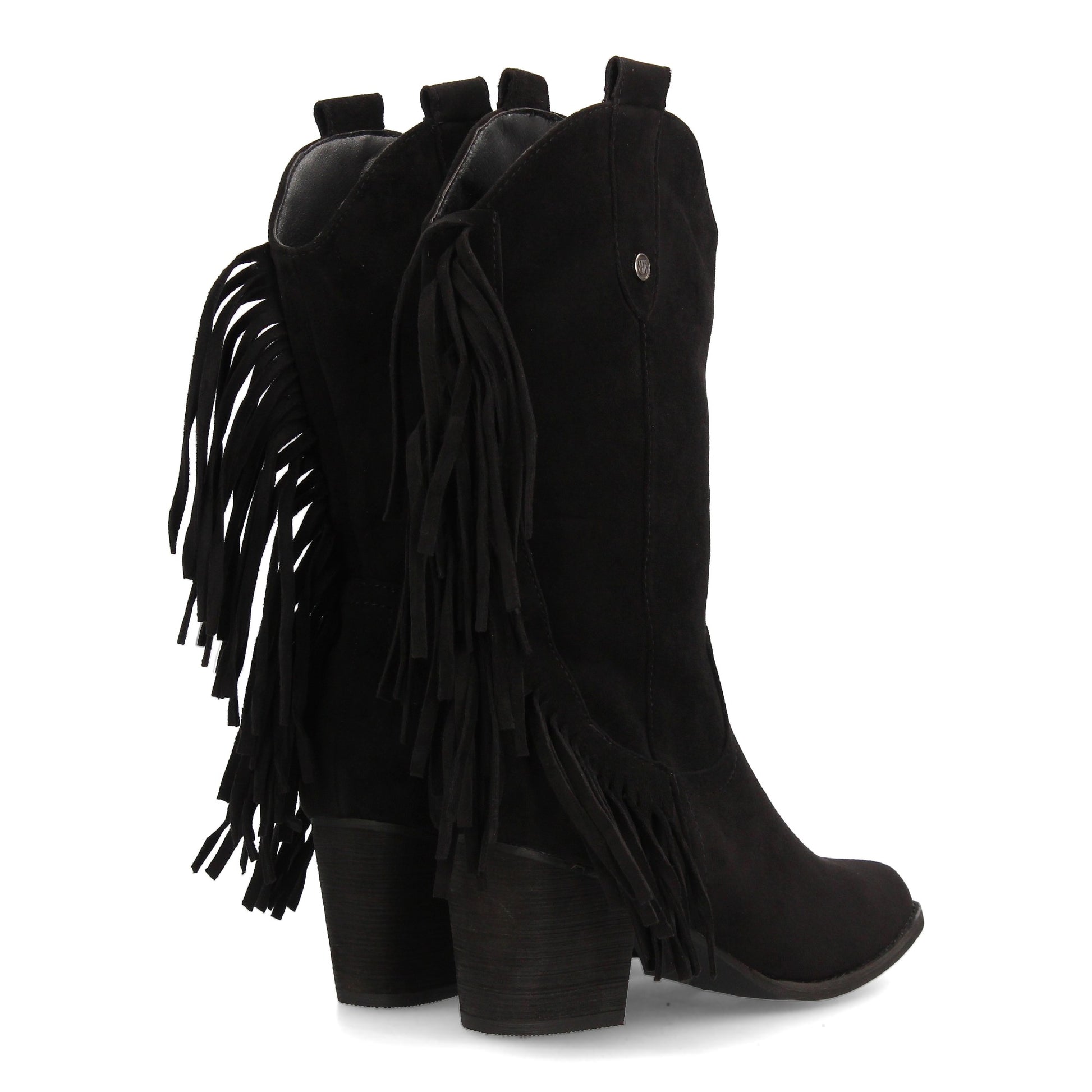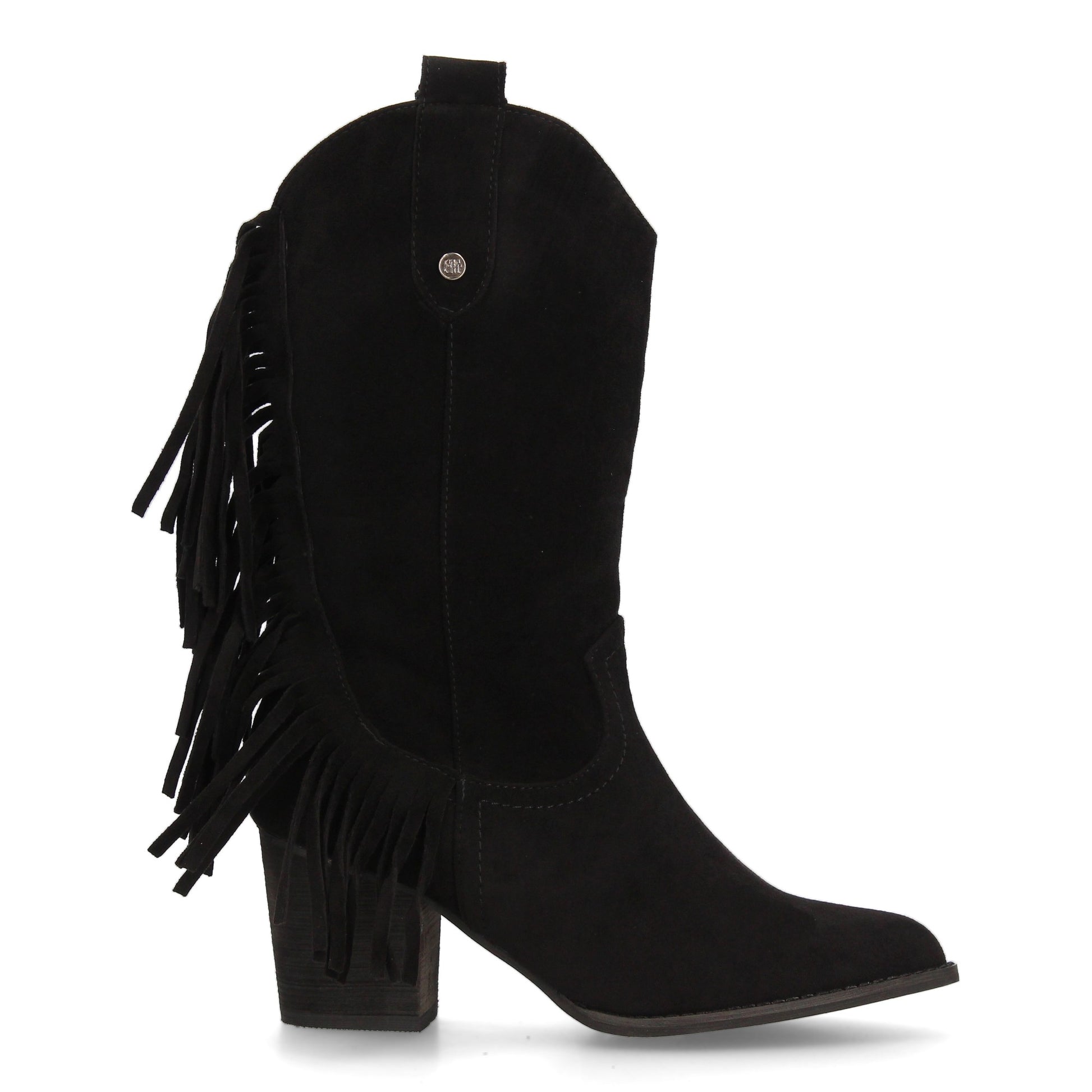 Bota de media caña cowboy con detalle de flecos laterales. Tacón ancho de altura media y tiradores. Cierre lateral con cremallera ideal temporada otoño invierno.