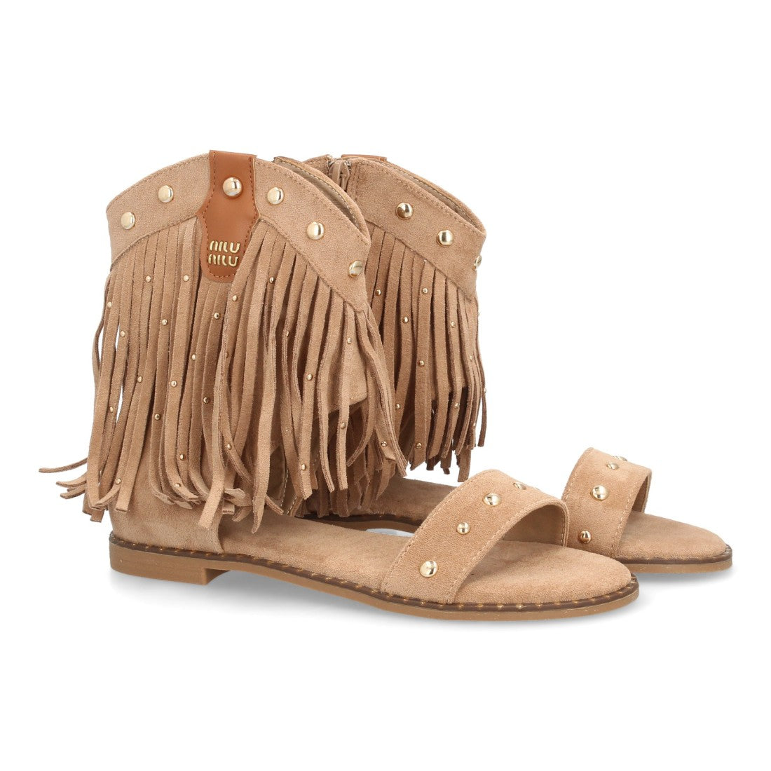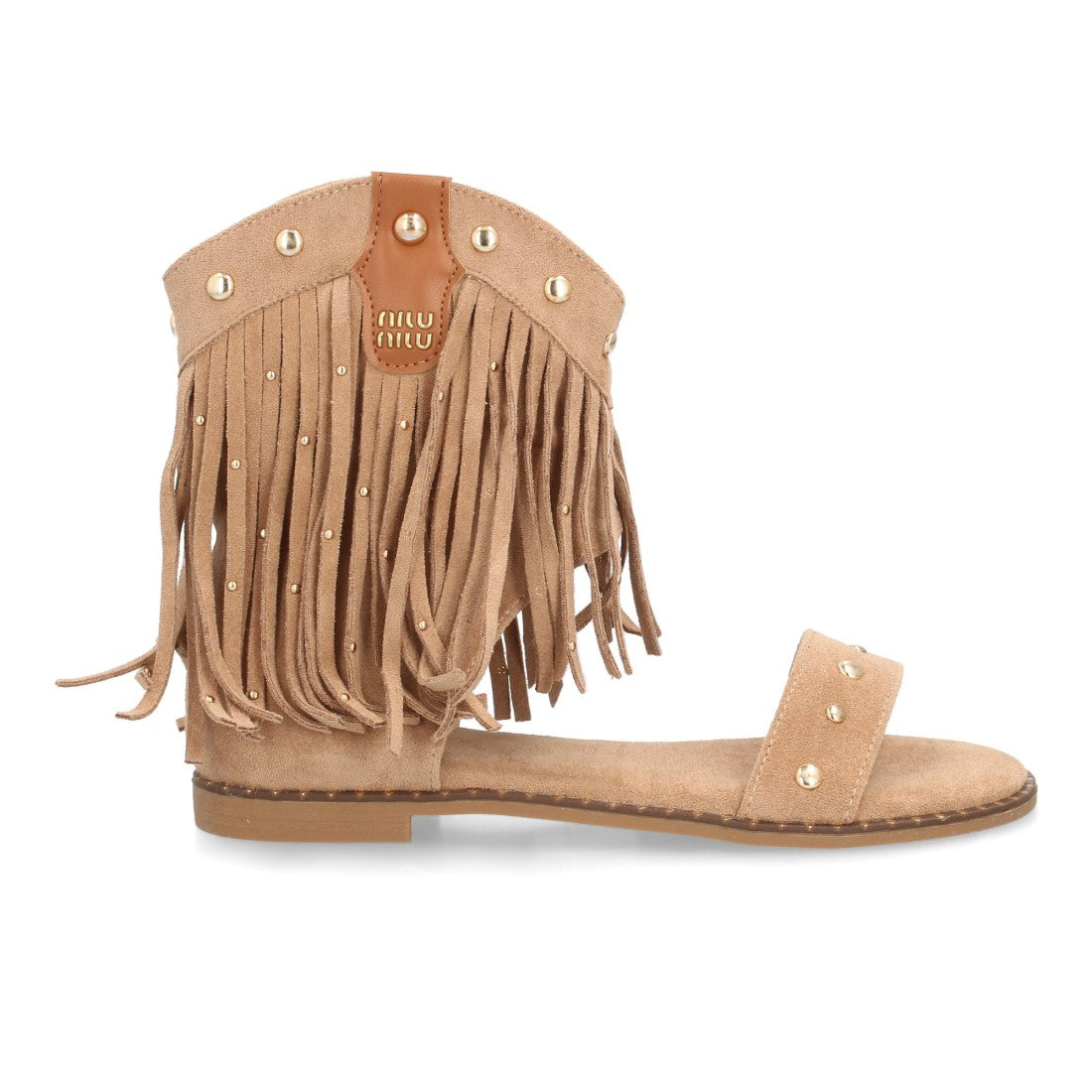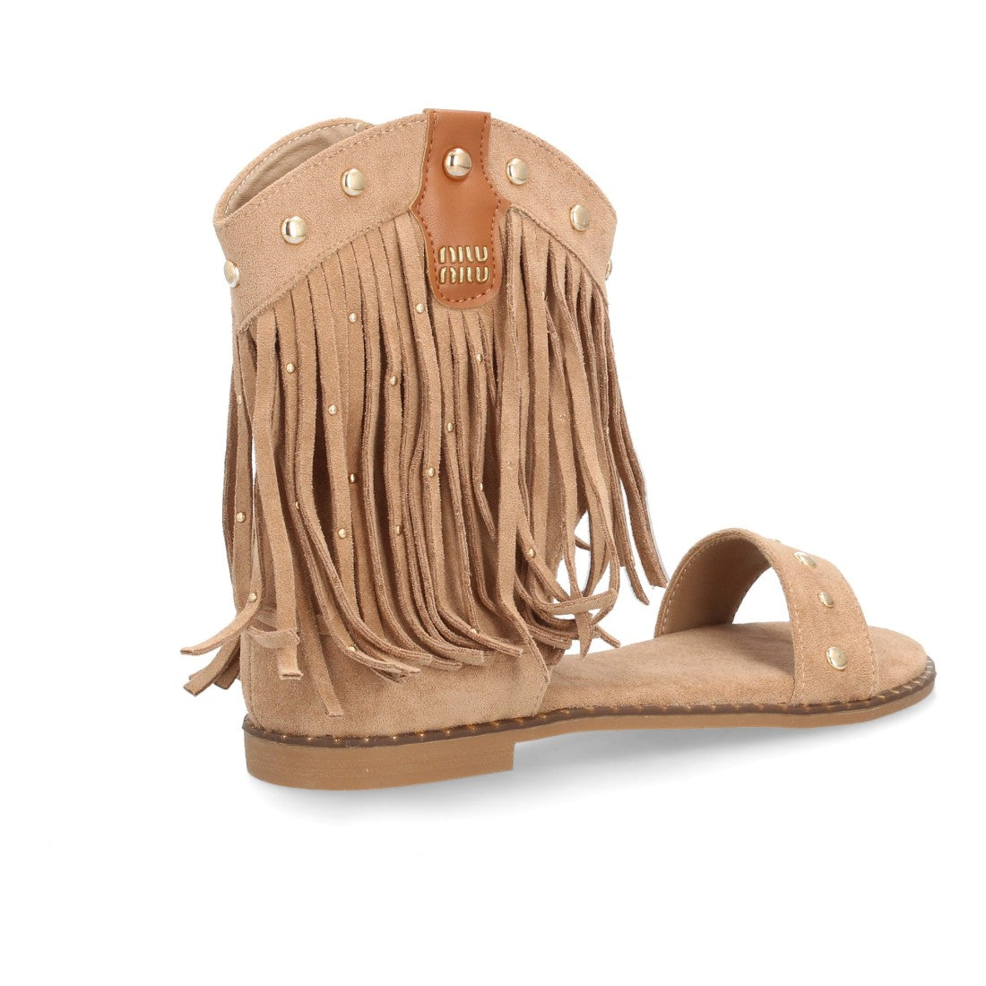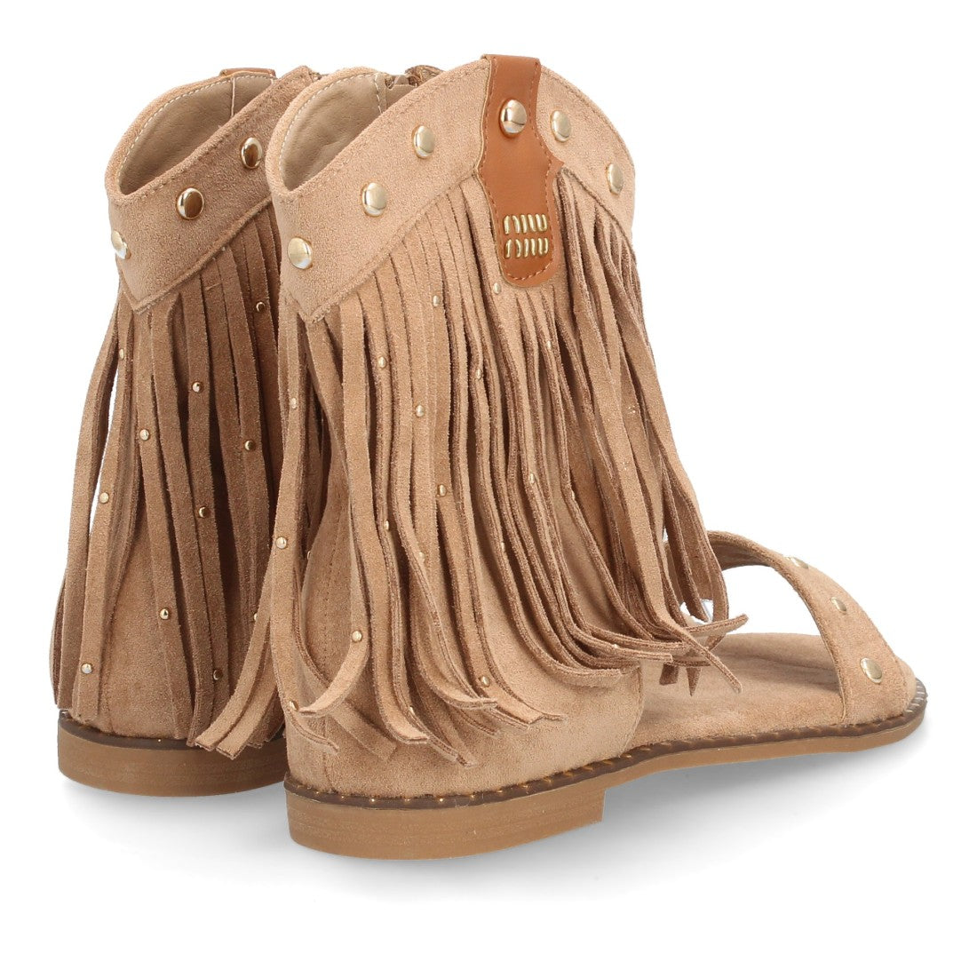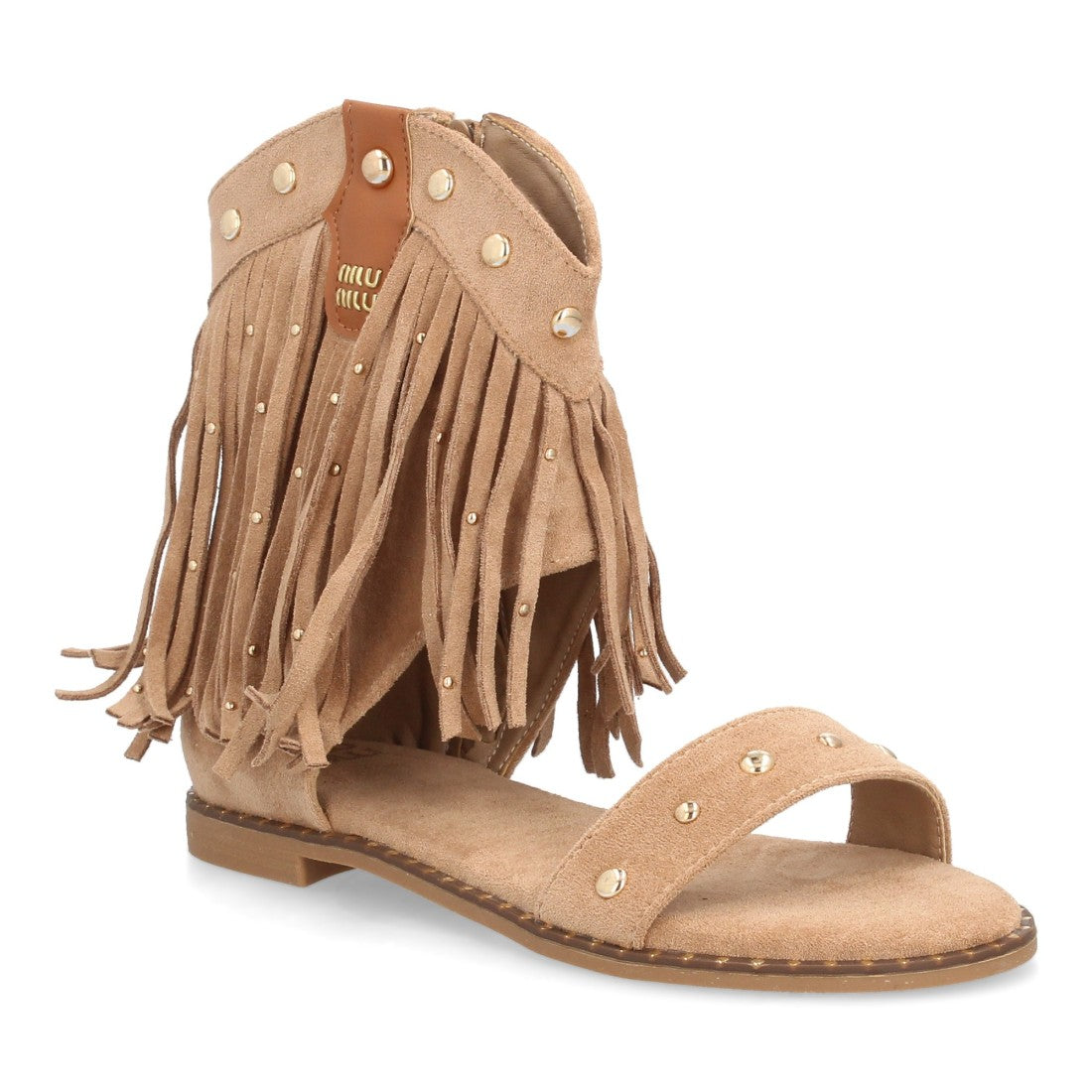 Sandalias planas boho western para mujer. Caña con flecos largos decorada con tachuelas metálicas tira ancha y cremallera trasera. Suela plana comoda ideal verano.