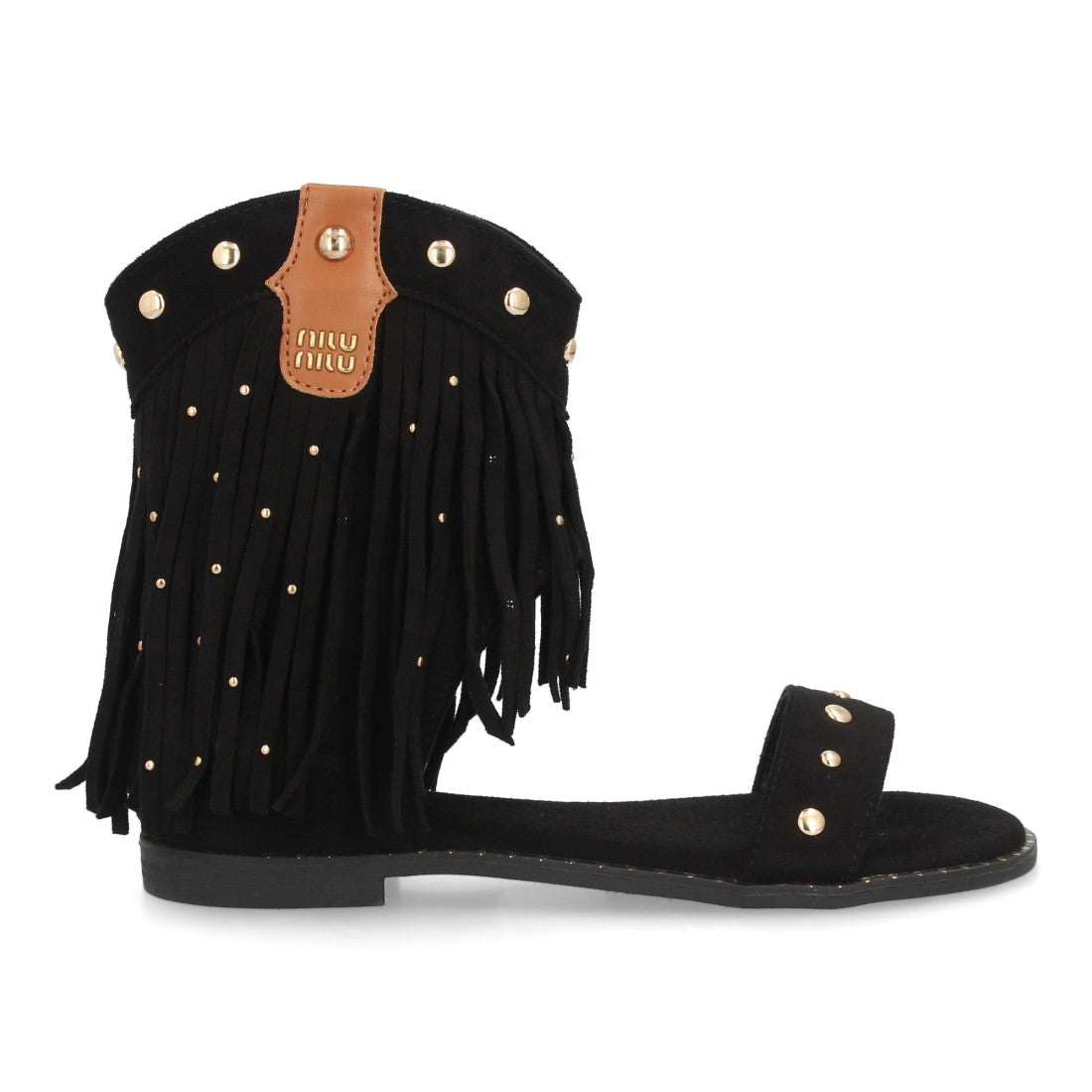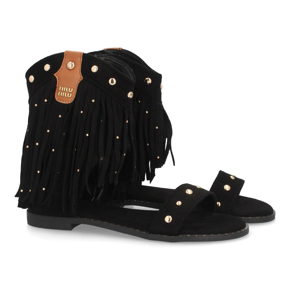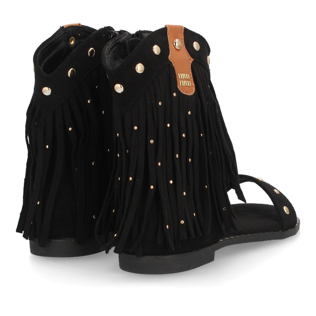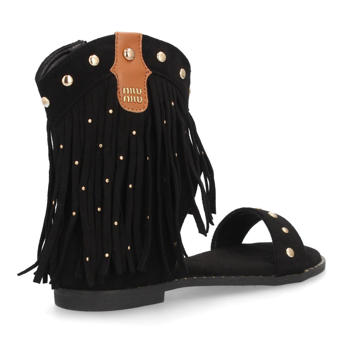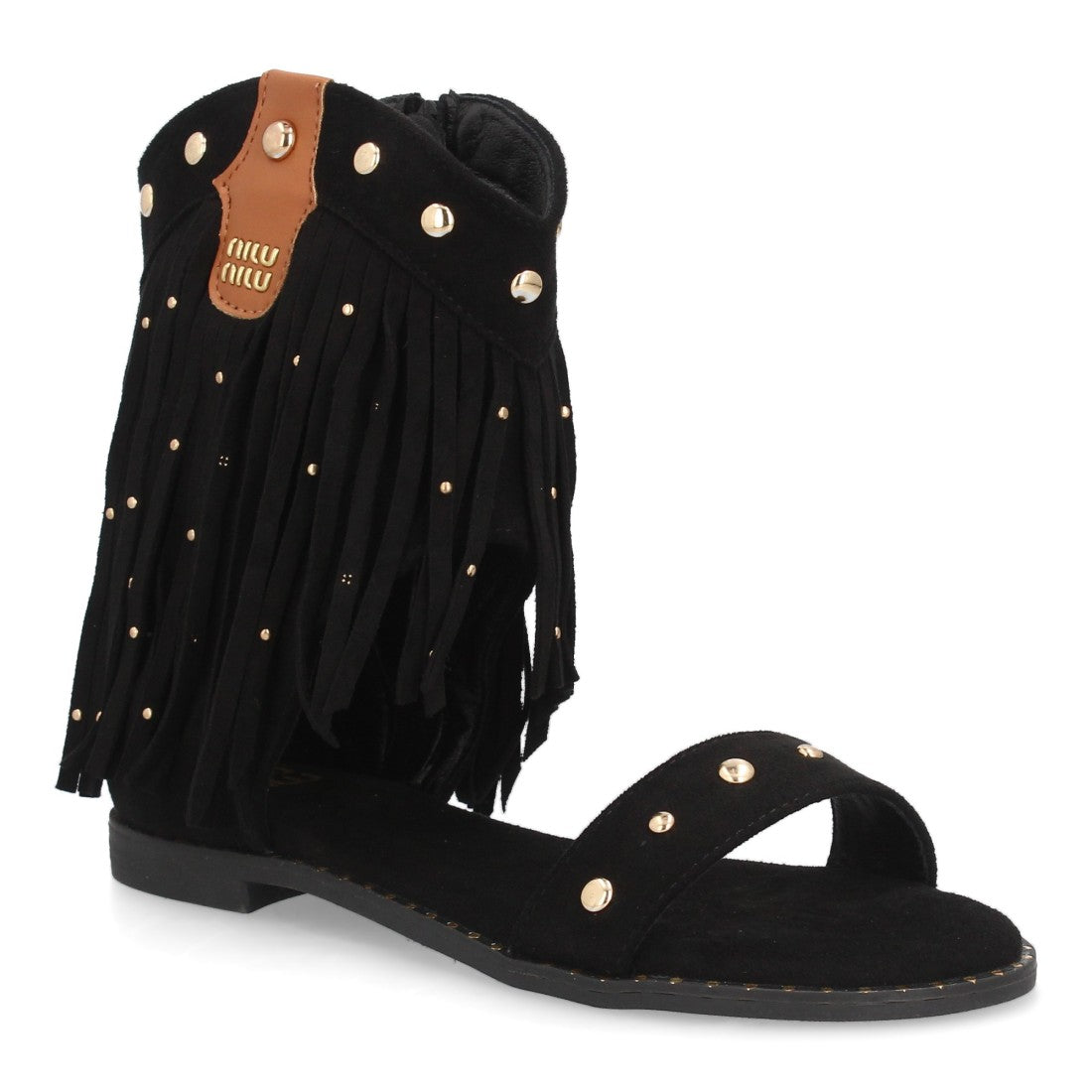Sandalias planas boho western para mujer. Caña con flecos largos decorada con tachuelas metálicas tira ancha y cremallera trasera. Suela plana comoda ideal verano.