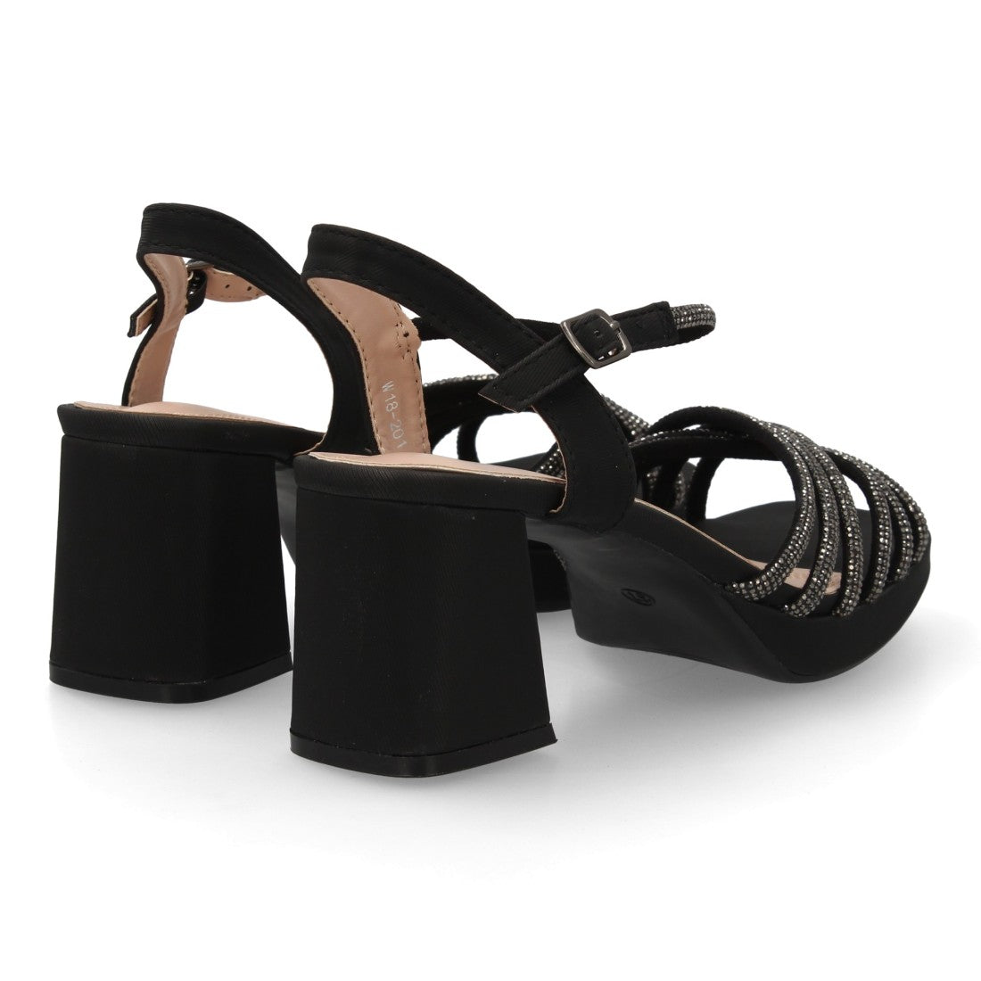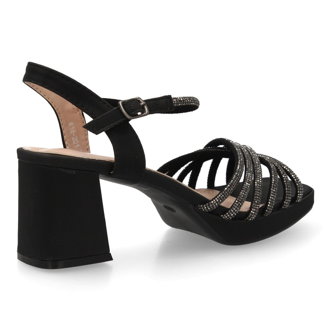 Sandalia de tacón ancho perfecta para eventos celebraciones y ocasiones especiales. Pala de tiras finas decoradas con brillantes cierre de hebilla comodas para mujer.