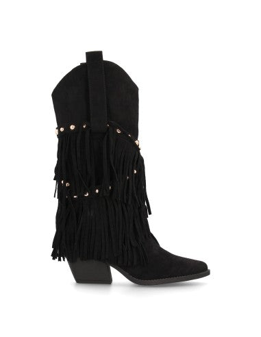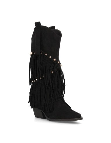 Bota de estilo western con caña alta decorada con flecos en cascada y tachuelas metálicas punta fina y tacón cubano. Ideal para mujer en temporada de Otoño Invierno