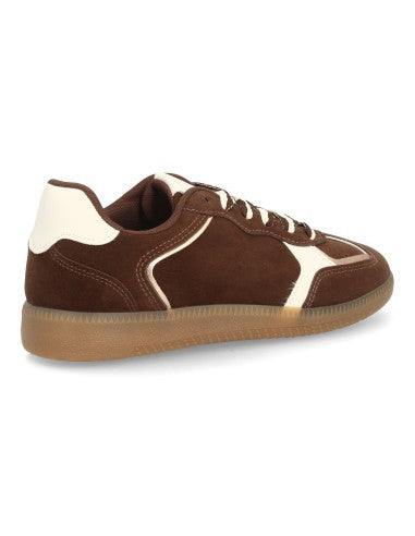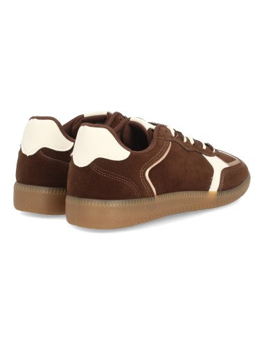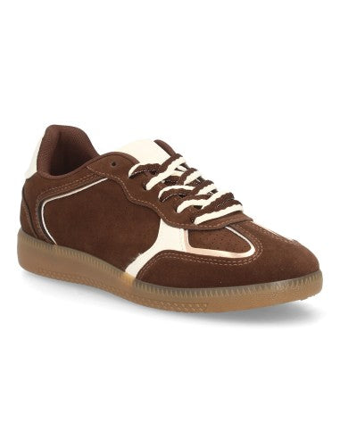 Deportiva para mujer estilo retro con cierre de cordones en dos colores. Materiales suabes y cómodos refuerzos en tonos metálicos. Suela plana ideal para el día a día.