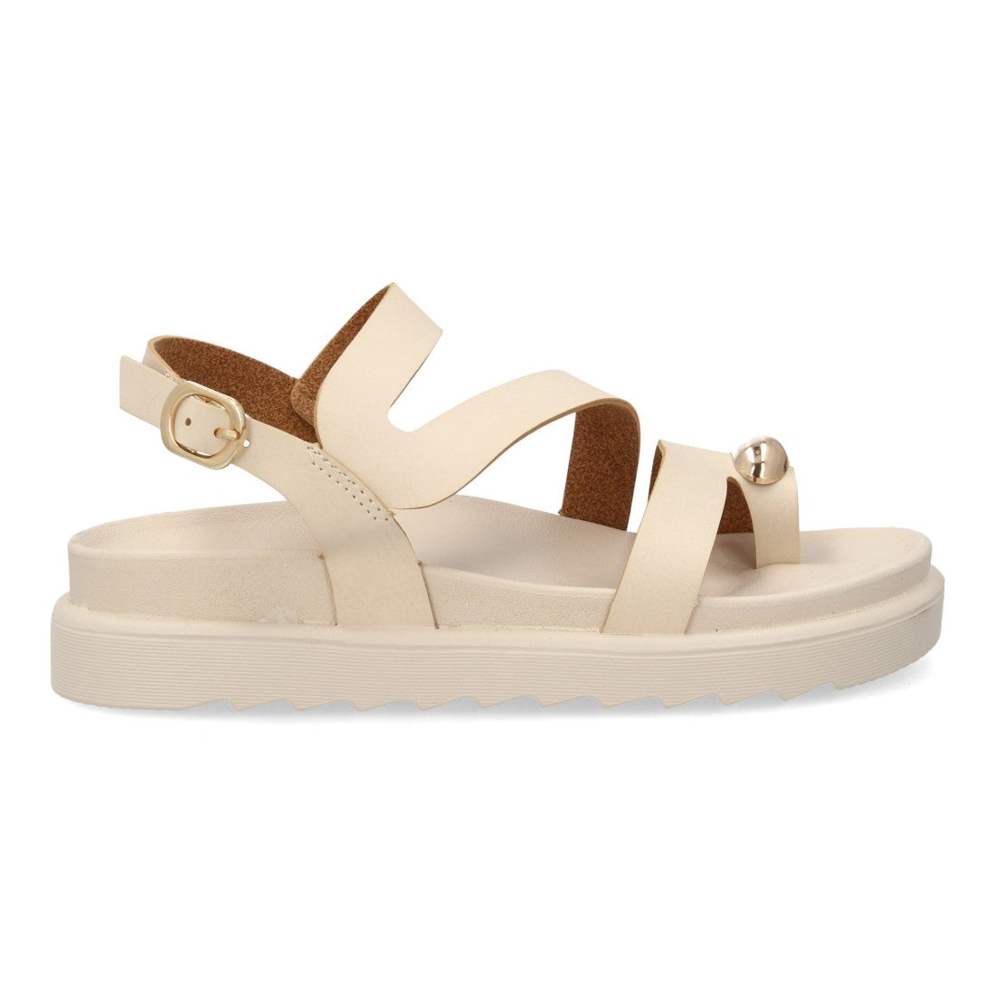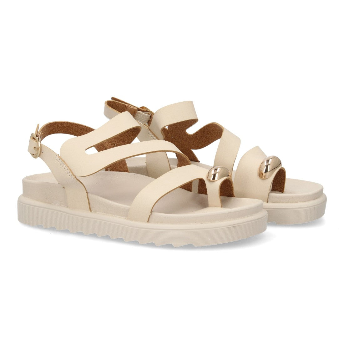 Sandalias de mujer con diseño de tiras anchas entrelazadas tira trasera con cierre de hebilla adorno metálico y sujeción en el dedo gordo. Suela plana y acolchada. Ideal verano.