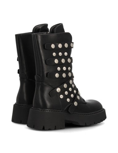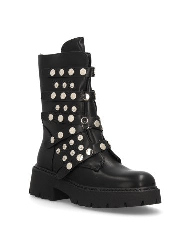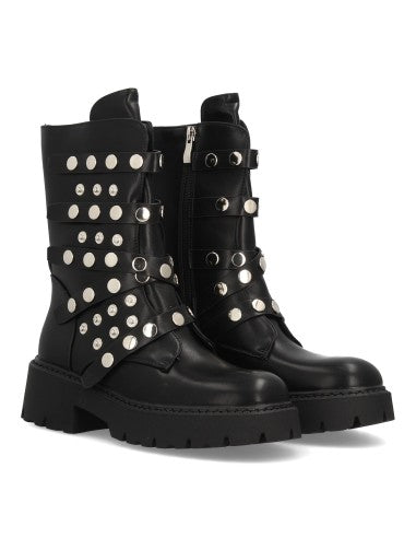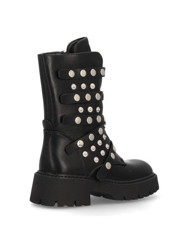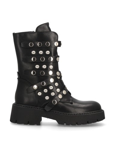Botín de plataforma para mujer con múltiples tiras decorativas con tachuelas metálicas suela gruesa de estilo track cierre de cremallera. Ideal Otoño Invierno.