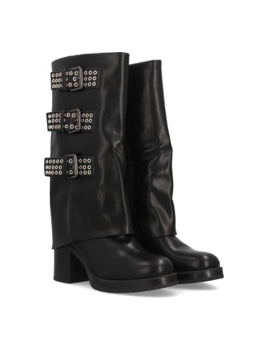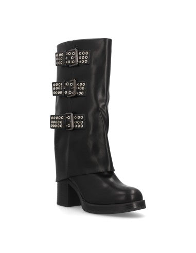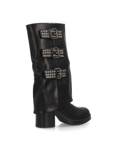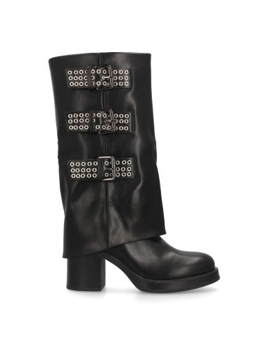 Botas para mujer de tacón y caña alta decorada con tres llamativas hebillas metálicas con ojales. Tacón ancho y cierre de cremallera. Ideal Otoño Invierno.