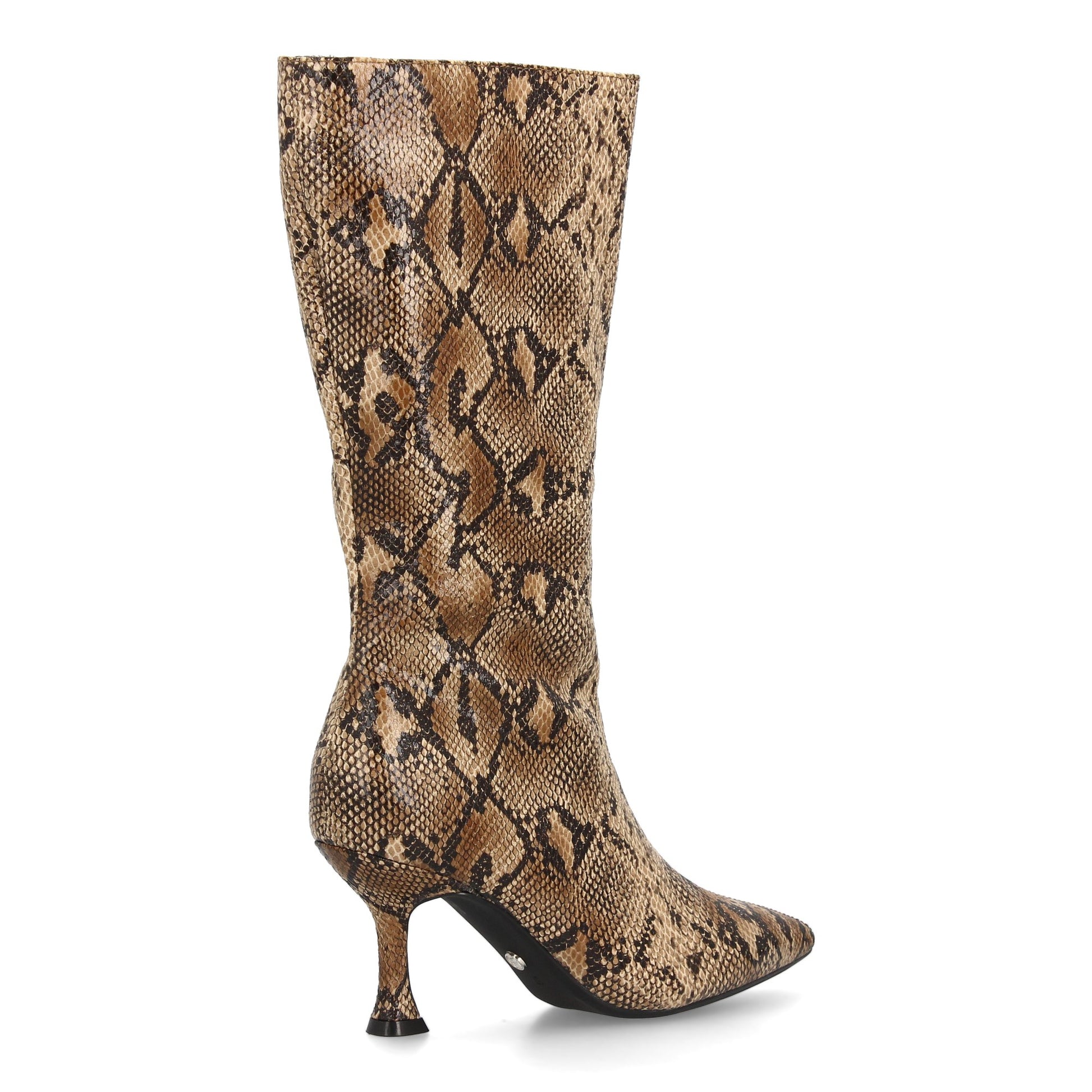 Bota alta de caña media diseño llamativo y sofisticado. Punta fina y tacón fino tipo kitten crean una silueta estilizada. Cierre de cremallera. Ideal para mujer en temporada otoño invierno.