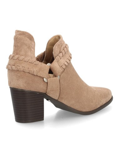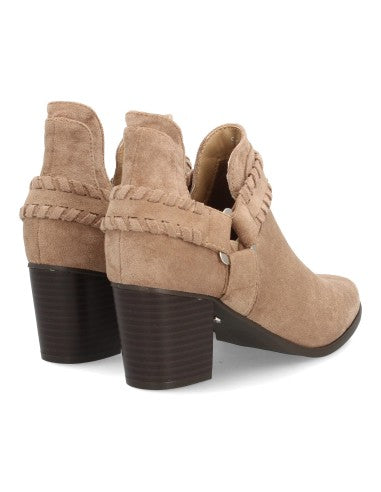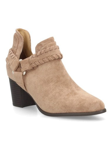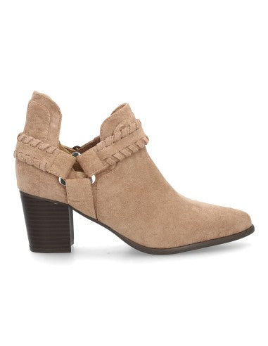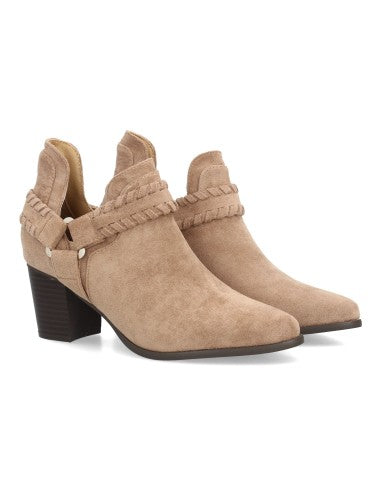 Botín con tacón para mujer con tiras tranzadas y detalle de hebilla triangular con corte lateral abierto acabado afelpado para entretiempo. Tacón comodo ideal uso diario.