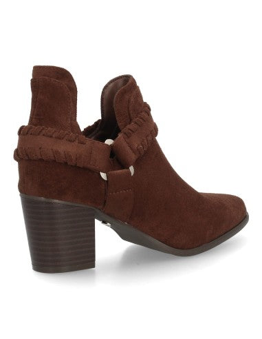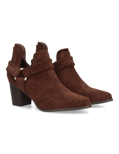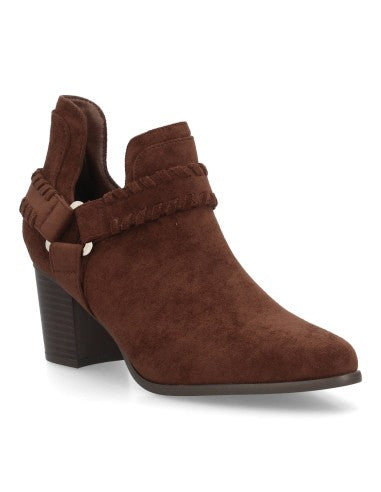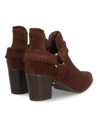 Botín con tacón para mujer con tiras tranzadas y detalle de hebilla triangular con corte lateral abierto acabado afelpado para entretiempo. Tacón comodo ideal uso diario.