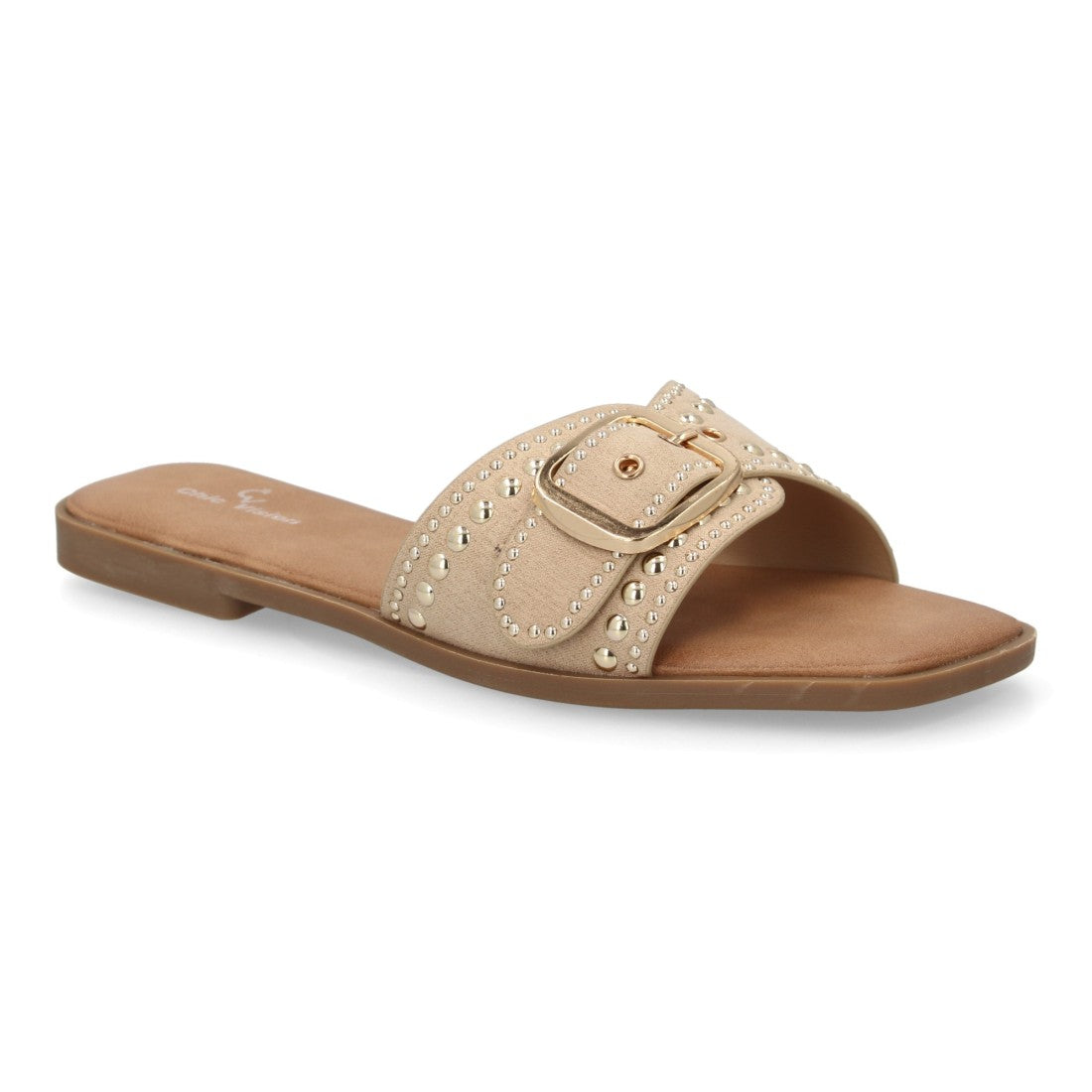 Sandalia tipo pala de mujer con diseño moderno banda ancha en el empeine con hebilla y tachuelas metálicas. Suela plana ligera y acolchada ideal para uso diario.