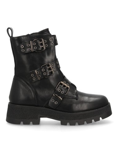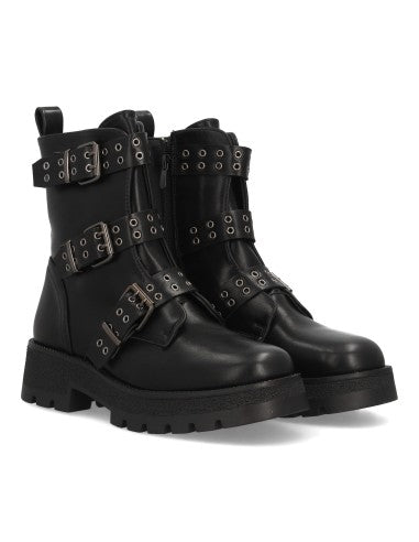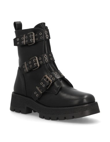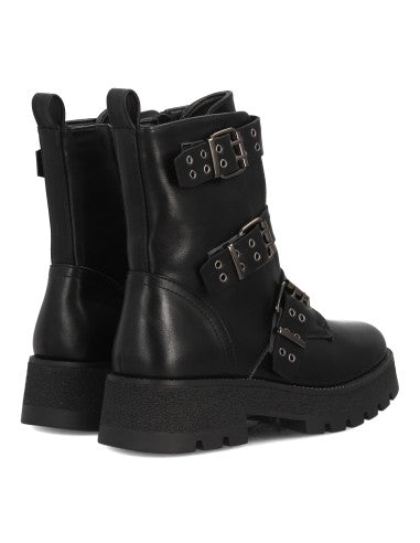 Botines para mujer con suela de plataforma adornado con múltiples tiras decorativas con hebillas y tachuelas metálicas con cierre de cremallera. Ideal para Otoño Invierno.