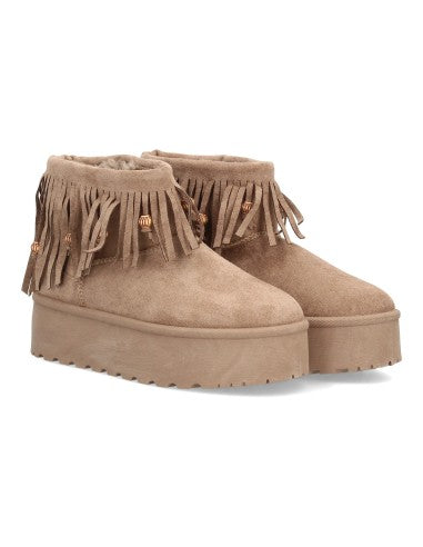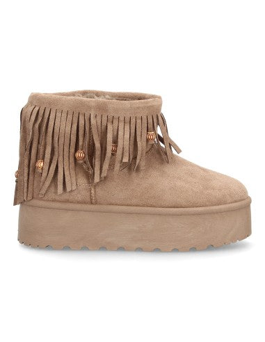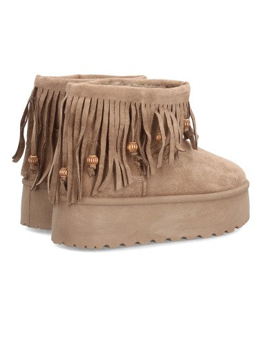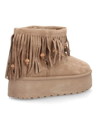 Botín Plano para Mujer con plataforma Estilo Australiano Forrado de Pelo caña decorada con flecos largos y abalorios. Punta Redonda sin cierre.