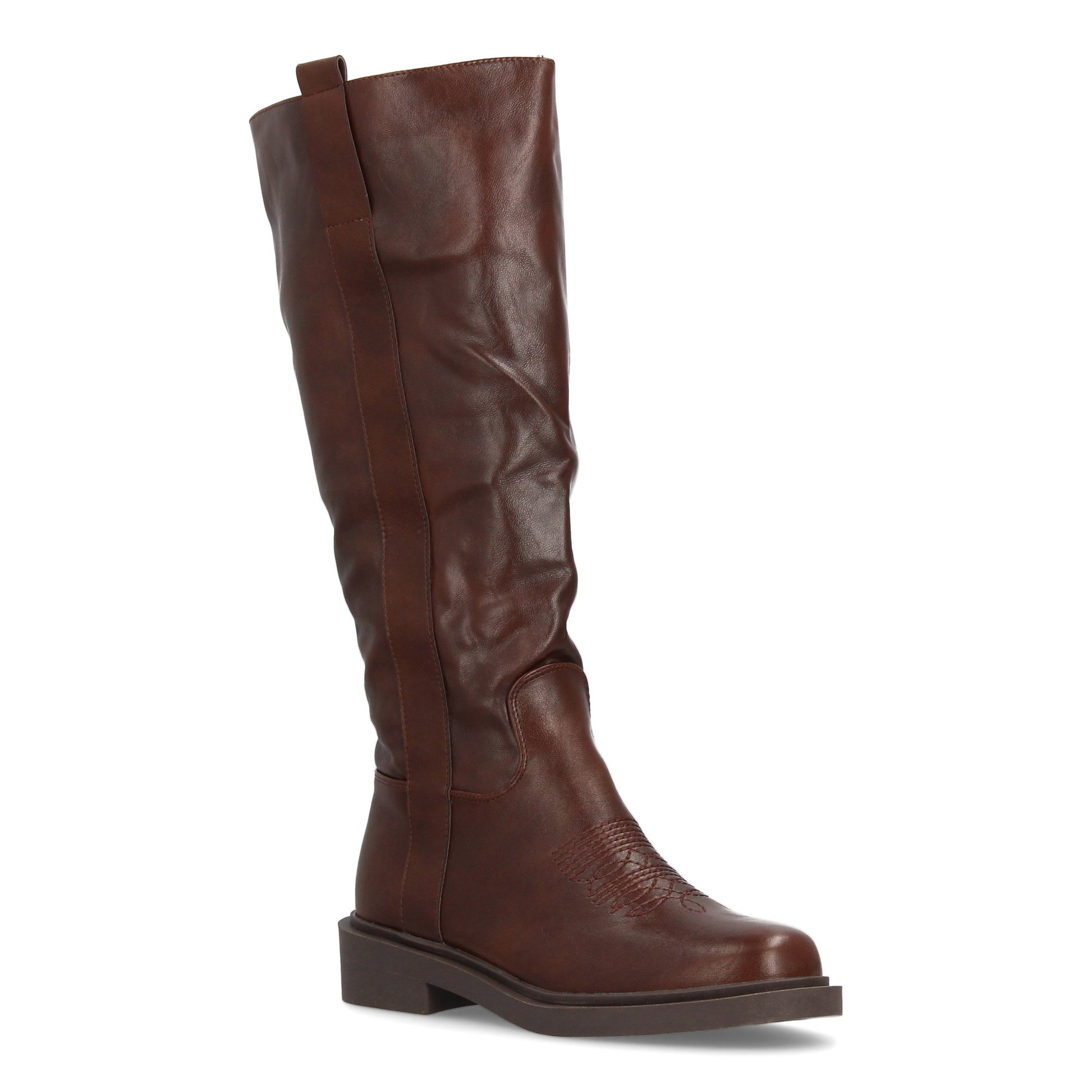 Bota alta para mujer con inspiración cowboy y detalle de bordado frontal paneles laterales elásticos y suela plana para mayor comodidad durante todo el día. Ideal temporada otoño invierno.